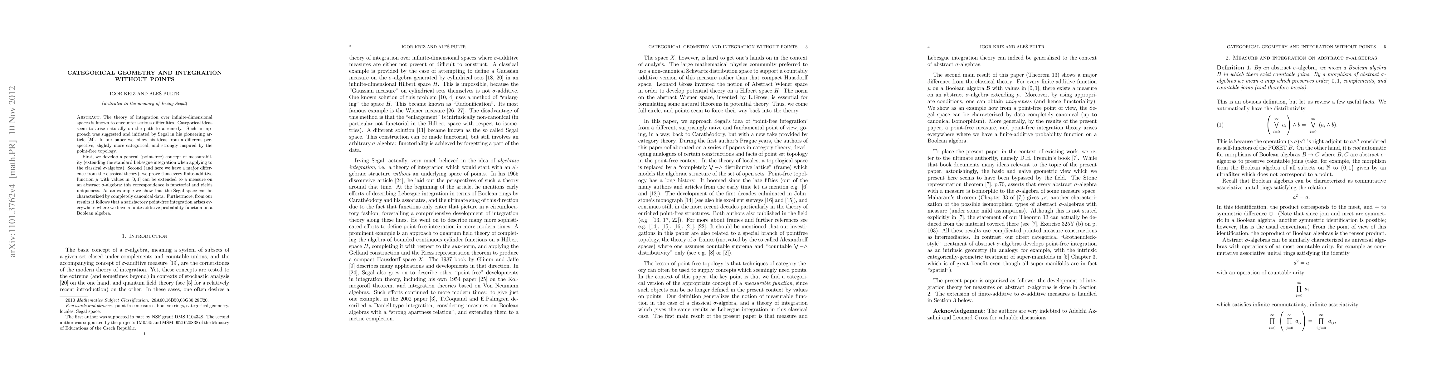 This paper develops a categorical, point-free approach to integration over infinite-dimensional spaces, extending Lebesgue integration and proving that any finite-additive probability function can be extended uniquely to a measure on an abstract σ-algebra, with applications to the Segal space.