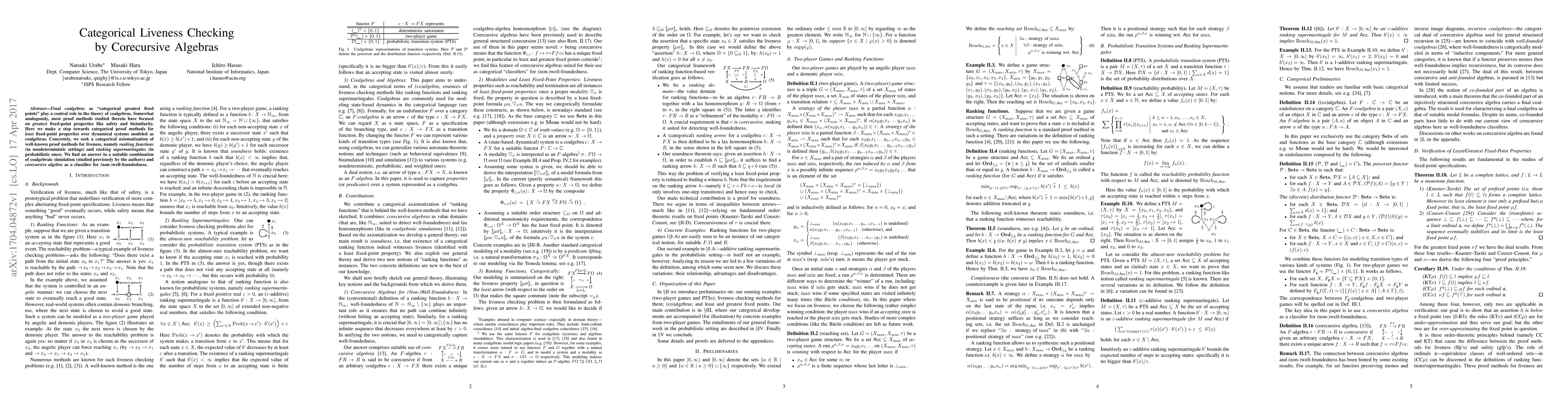 This paper proposes a categorical framework for liveness checking in dynamical systems using coalgebras, focusing on least fixed-point properties. It combines coalgebraic simulation and corecursive algebra to axiomatize ranking functions and supermartingales for liveness verification.