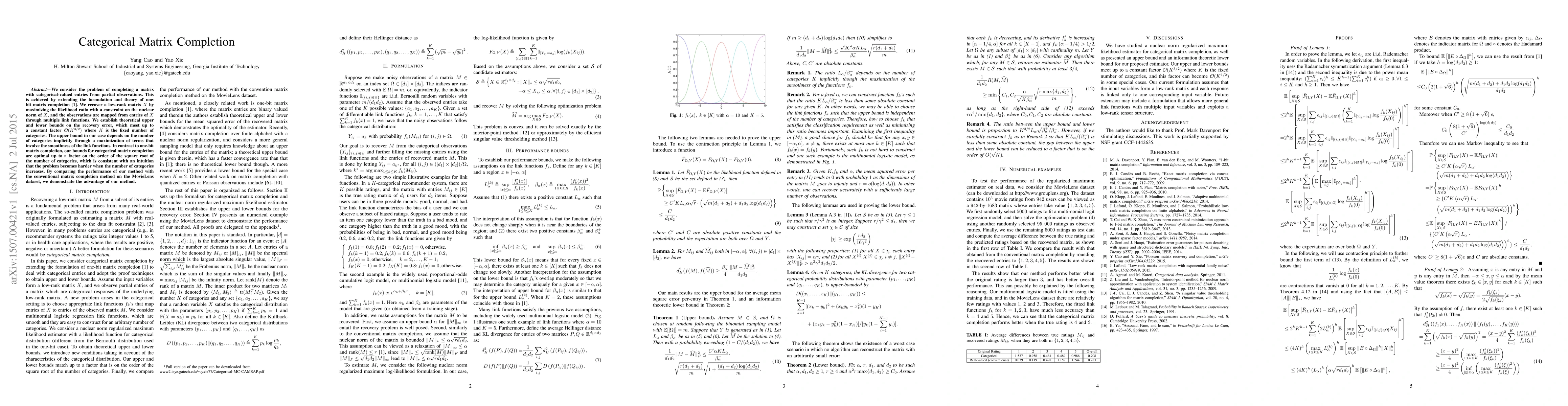 This paper addresses the problem of completing matrices with categorical entries using partial observations, extending one-bit matrix completion. The authors propose a method to recover a low-rank matrix by maximizing the likelihood ratio with nuclear norm constraints, establishing optimal bounds on the recovery error that depend on the number of categories. Experimental results on the MovieLens dataset show the method's advantage over conventional matrix completion.