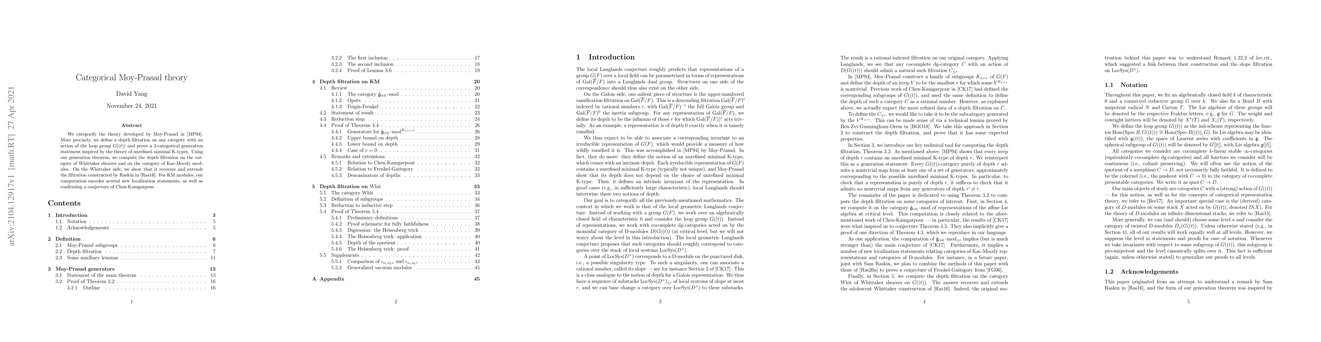 We categorify the theory developed by Moy-Prasad in [MP94]. More precisely, we define a depth filtration on any category with an action of the loop group $G((t))$ and prove a $2$-categorical generation statement inspired by the theory of unrefined minimal K-types. Using our generation theorem, we compute the depth filtration on the category of Whittaker sheaves and on the category of Kac-Moody modules. On the Whittaker side, we show that it recovers and extends the filtration constructed by Raskin in [Ras16]. For KM modules, our computation encodes several new localization statements, as well as confirming a conjecture of Chen-Kamgarpour.