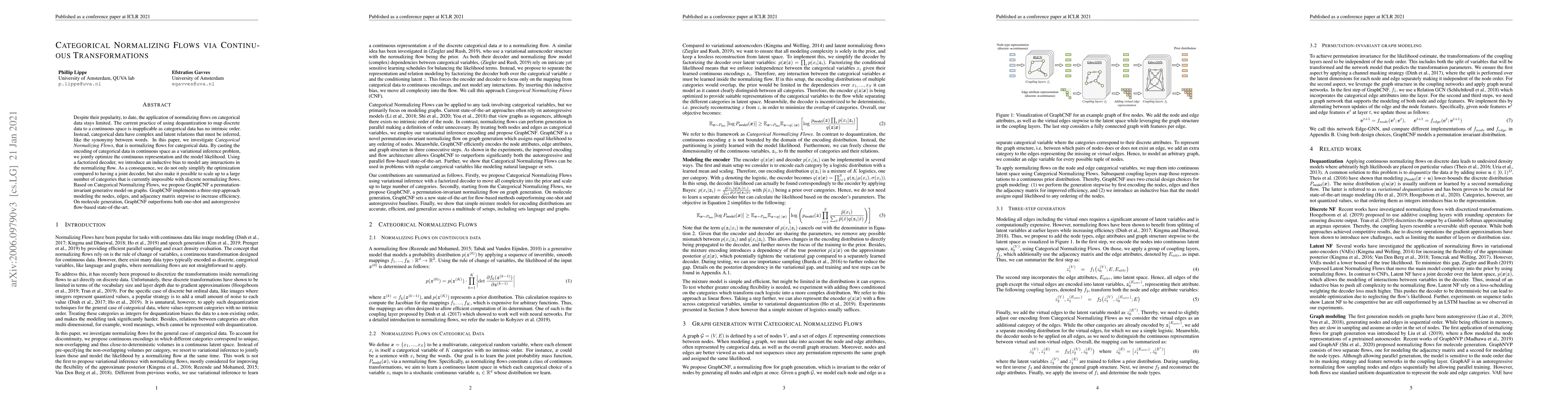 This paper proposes Categorical Normalizing Flows, a method to transform categorical data into continuous space via variational inference, enabling interactions modeling and scaling to large categories. It introduces GraphCNF, a permutation-invariant generative model on graphs, which outperforms state-of-the-art methods in molecule generation.
