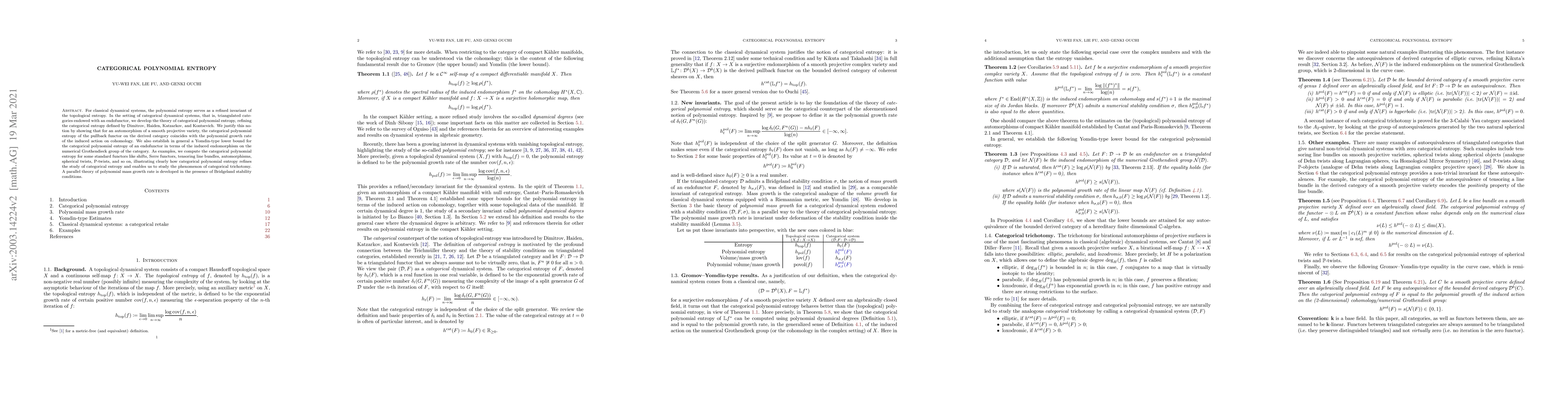 For classical dynamical systems, the polynomial entropy serves as a refined invariant of the topological entropy. In the setting of categorical dynamical systems, that is, triangulated categories endowed with an endofunctor, we develop the theory of categorical polynomial entropy, refining the categorical entropy defined by Dimitrov-Haiden-Katzarkov-Kontsevich. We justify this notion by showing that for an automorphism of a smooth projective variety, the categorical polynomial entropy of the pullback functor on the derived category coincides with the polynomial growth rate of the induced action on cohomology. We also establish in general a Yomdin-type lower bound for the categorical polynomial entropy of an endofunctor in terms of the induced endomorphism on the numerical Grothendieck group of the category. As examples, we compute the categorical polynomial entropy for some standard functors like shifts, Serre functors, tensoring line bundles, automorphisms, spherical twists, P-twists, and so on, illustrating clearly how categorical polynomial entropy refines the study of categorical entropy and enables us to study the phenomenon of categorical trichotomy. A parallel theory of polynomial mass growth rate is developed in the presence of Bridgeland stability conditions.