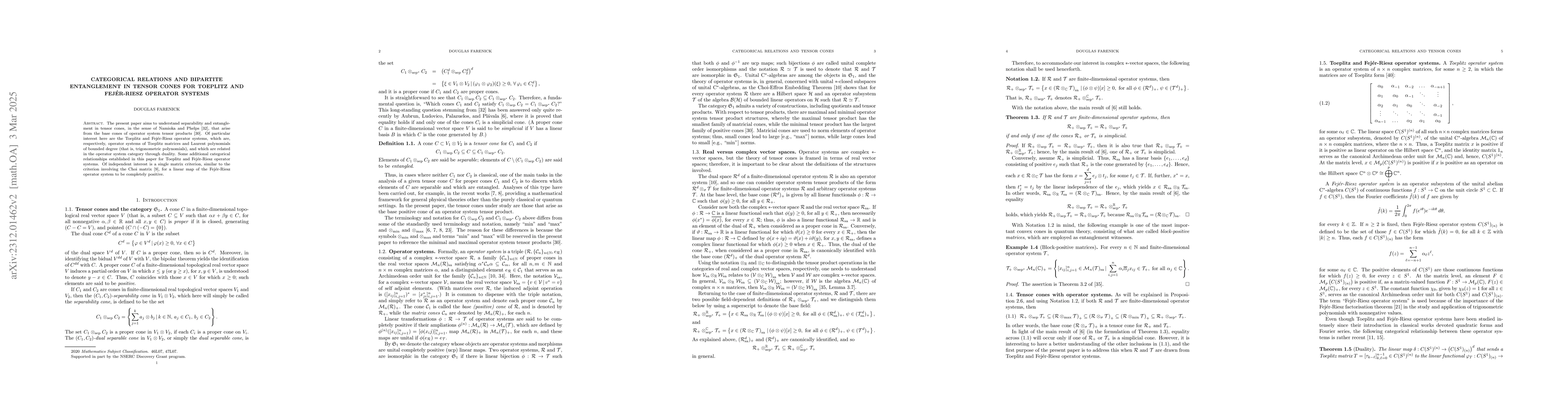 This paper explores separability and entanglement in tensor cones of Toeplitz and Fejér-Riesz operator systems, establishing C$^*$-nuclearity and unique operator system structures. It introduces a matrix criterion for completely positive maps in Fejér-Riesz systems and extends Haagerup's extension theorem for higher-dimensional Toeplitz matrices.