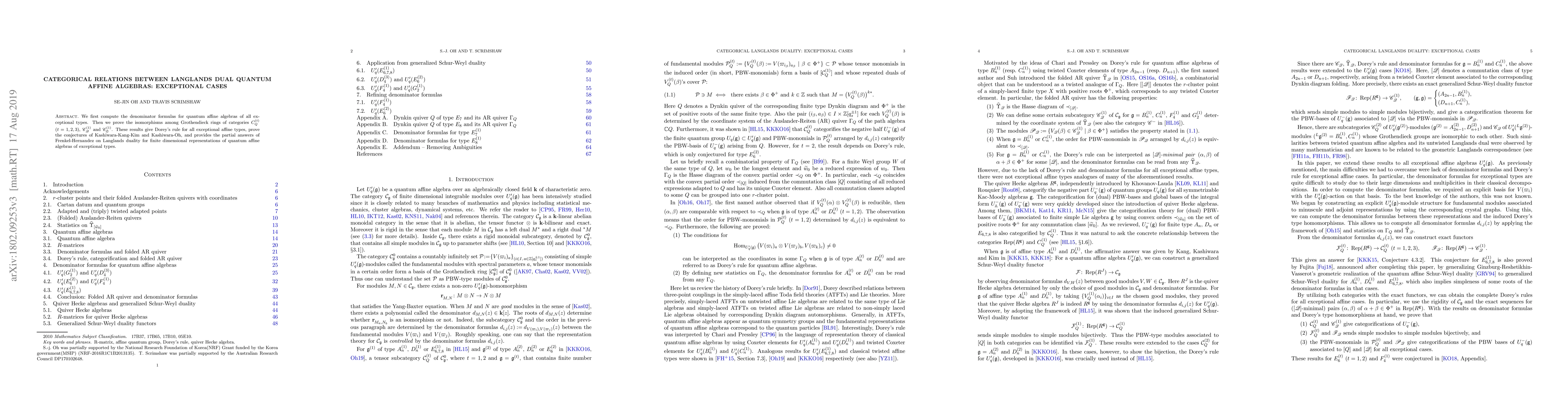 This paper computes denominator formulas for exceptional quantum affine algebras and establishes isomorphisms among Grothendieck rings of certain categories, proving conjectures and providing insights into Langlands duality for exceptional types.