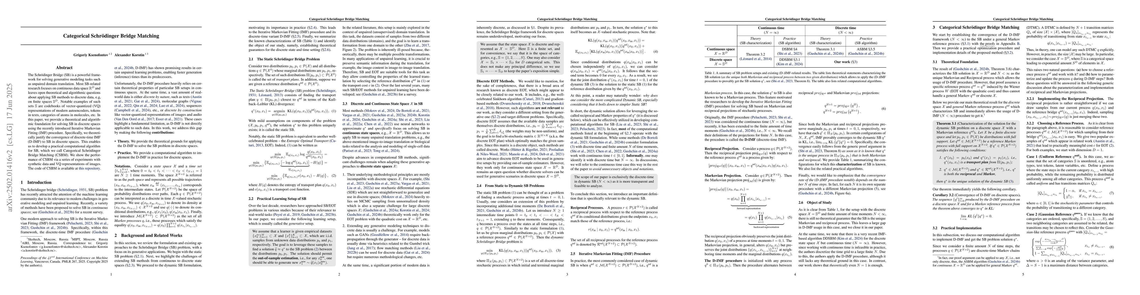 This paper presents Categorical Schrödinger Bridge Matching (CSBM), a new algorithm for applying Schrödinger Bridge (SB) methods to discrete data spaces, like codebooks or categories. The research theoretically justifies the convergence of discrete-time IMF (D-IMF) to SB in discrete spaces, enabling practical computation via CSBM. Performance is demonstrated through experiments with synthetic data and image VQ representations.