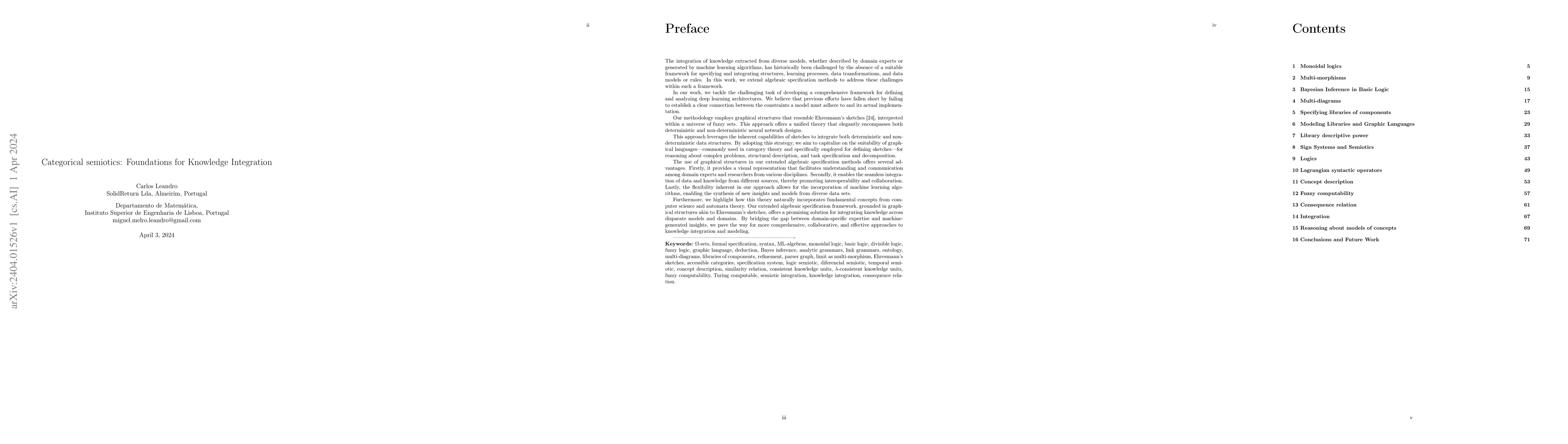 The integration of knowledge extracted from diverse models, whether described by domain experts or generated by machine learning algorithms, has historically been challenged by the absence of a suitable framework for specifying and integrating structures, learning processes, data transformations, and data models or rules. In this work, we extend algebraic specification methods to address these challenges within such a framework. In our work, we tackle the challenging task of developing a comprehensive framework for defining and analyzing deep learning architectures. We believe that previous efforts have fallen short by failing to establish a clear connection between the constraints a model must adhere to and its actual implementation. Our methodology employs graphical structures that resemble Ehresmann's sketches, interpreted within a universe of fuzzy sets. This approach offers a unified theory that elegantly encompasses both deterministic and non-deterministic neural network designs. Furthermore, we highlight how this theory naturally incorporates fundamental concepts from computer science and automata theory. Our extended algebraic specification framework, grounded in graphical structures akin to Ehresmann's sketches, offers a promising solution for integrating knowledge across disparate models and domains. By bridging the gap between domain-specific expertise and machine-generated insights, we pave the way for more comprehensive, collaborative, and effective approaches to knowledge integration and modeling.