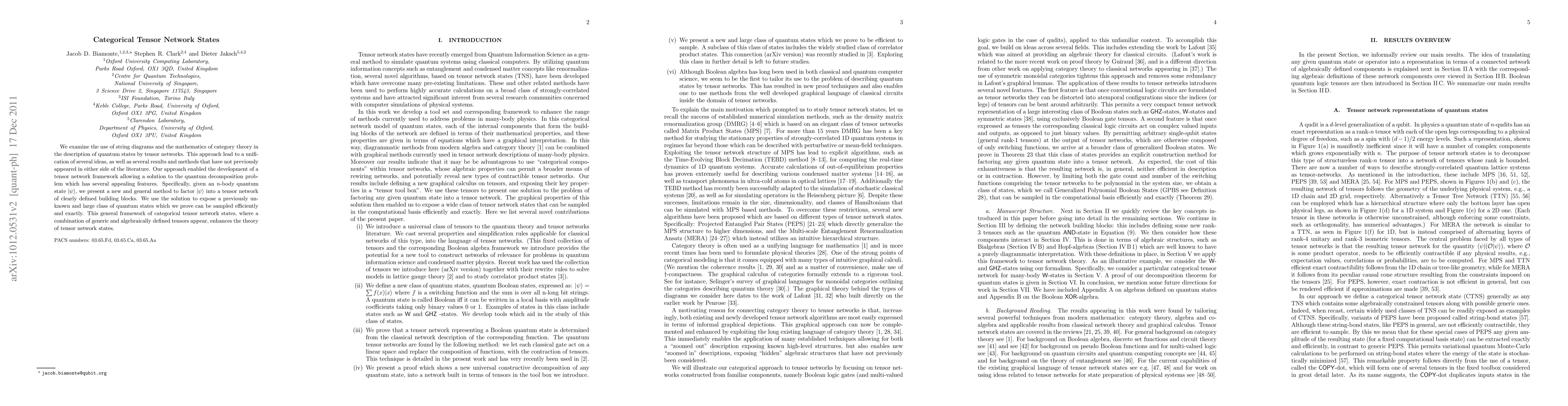 We examine the use of string diagrams and the mathematics of category theory in the description of quantum states by tensor networks. This approach lead to a unification of several ideas, as well as several results and methods that have not previously appeared in either side of the literature. Our approach enabled the development of a tensor network framework allowing a solution to the quantum decomposition problem which has several appealing features. Specifically, given an n-body quantum state S, we present a new and general method to factor S into a tensor network of clearly defined building blocks. We use the solution to expose a previously unknown and large class of quantum states which we prove can be sampled efficiently and exactly. This general framework of categorical tensor network states, where a combination of generic and algebraically defined tensors appear, enhances the theory of tensor network states.