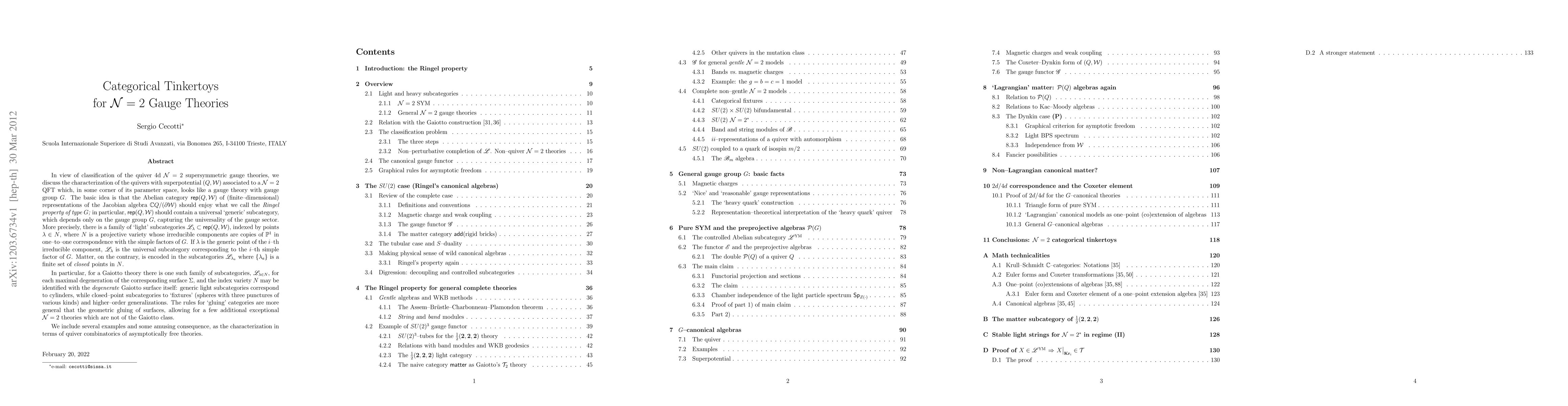 In view of classification of the quiver 4d N=2 supersymmetric gauge theories, we discuss the characterization of the quivers with superpotential (Q,W) associated to a N=2 QFT which, in some corner of its parameter space, looks like a gauge theory with gauge group G. The basic idea is that the Abelian category rep(Q,W) of (finite-dimensional) representations of the Jacobian algebra $\mathbb{C} Q/(\partial W)$ should enjoy what we call the Ringel property of type G; in particular, rep(Q,W) should contain a universal `generic' subcategory, which depends only on the gauge group G, capturing the universality of the gauge sector. There is a family of 'light' subcategories $\mathscr{L}_\lambda\subset rep(Q,W)$, indexed by points $\lambda\in N$, where $N$ is a projective variety whose irreducible components are copies of $\mathbb{P}^1$ in one--to--one correspondence with the simple factors of G. In particular, for a Gaiotto theory there is one such family of subcategories, $\mathscr{L}_{\lambda\in N}$, for each maximal degeneration of the corresponding surface $\Sigma$, and the index variety $N$ may be identified with the degenerate Gaiotto surface itself: generic light subcategories correspond to cylinders, while closed-point subcategories to `fixtures' (spheres with three punctures of various kinds) and higher-order generalizations. The rules for `gluing' categories are more general that the geometric gluing of surfaces, allowing for a few additional exceptional N=2 theories which are not of the Gaiotto class.