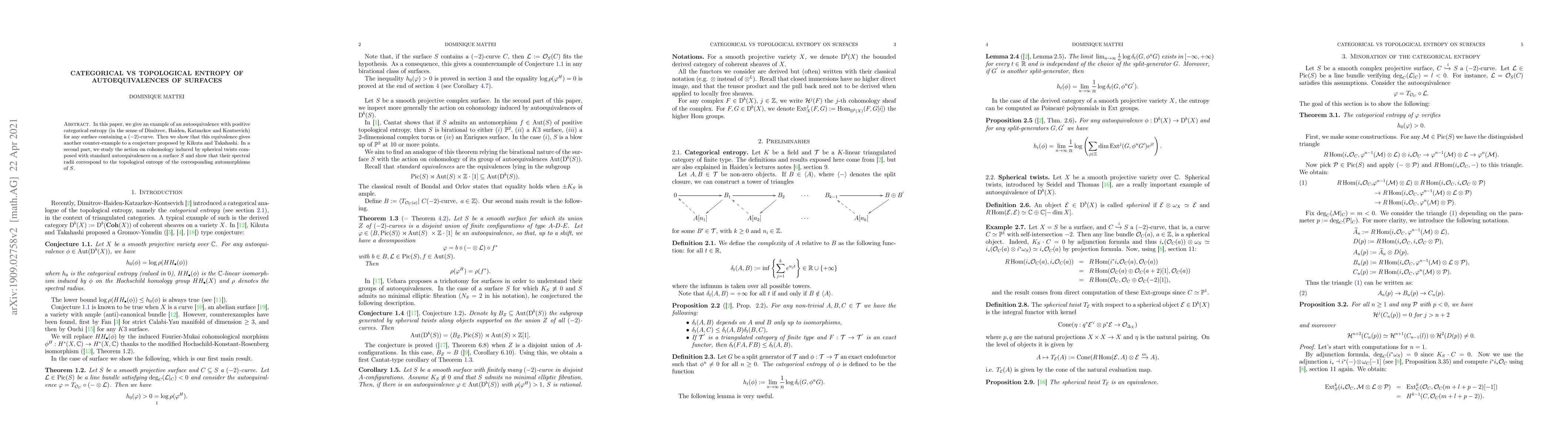 This paper demonstrates an autoequivalence with positive categorical entropy for surfaces containing (-2)-curves, providing a counterexample to a conjecture by Kikuta and Takahashi. It also links the spectral radii of spherical twists on a surface to the topological entropy of corresponding automorphisms.