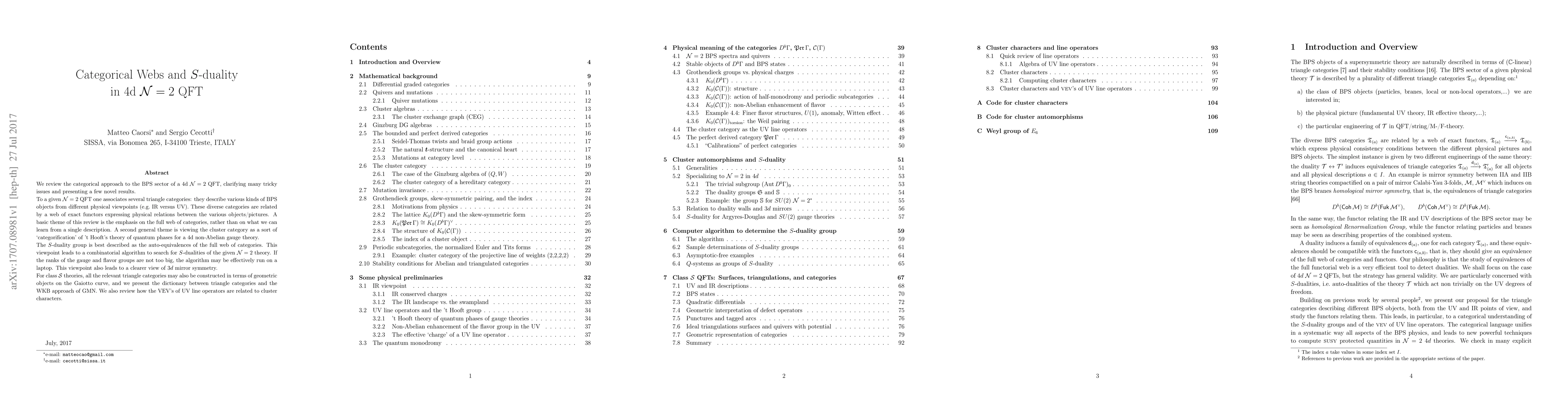 We review the categorical approach to the BPS sector of a 4d $\mathcal{N}=2$ QFT, clarifying many tricky issues and presenting a few novel results. To a given $\mathcal{N}=2$ QFT one associates several triangle categories: they describe various kinds of BPS objects from different physical viewpoints (e.g. IR versus UV). These diverse categories are related by a web of exact functors expressing physical relations between the various objects/pictures. A basic theme of this review is the emphasis on the full web of categories, rather than on what we can learn from a single description. A second general theme is viewing the cluster category as a sort of `categorification' of 't Hooft's theory of quantum phases for a 4d non-Abelian gauge theory. The $S$-duality group is best described as the auto-equivalences of the full web of categories. This viewpoint leads to a combinatorial algorithm to search for $S$-dualities of the given $\mathcal{N}=2$ theory. If the ranks of the gauge and flavor groups are not too big, the algorithm may be effectively run on a laptop. This viewpoint also leads to a clearer view of $3d$ mirror symmetry. For class $\mathcal{S}$ theories, all the relevant triangle categories may also be constructed in terms of geometric objects on the Gaiotto curve, and we present the dictionary between triangle categories and the WKB approach of GMN. We also review how the VEV's of UV line operators are related to cluster characters.