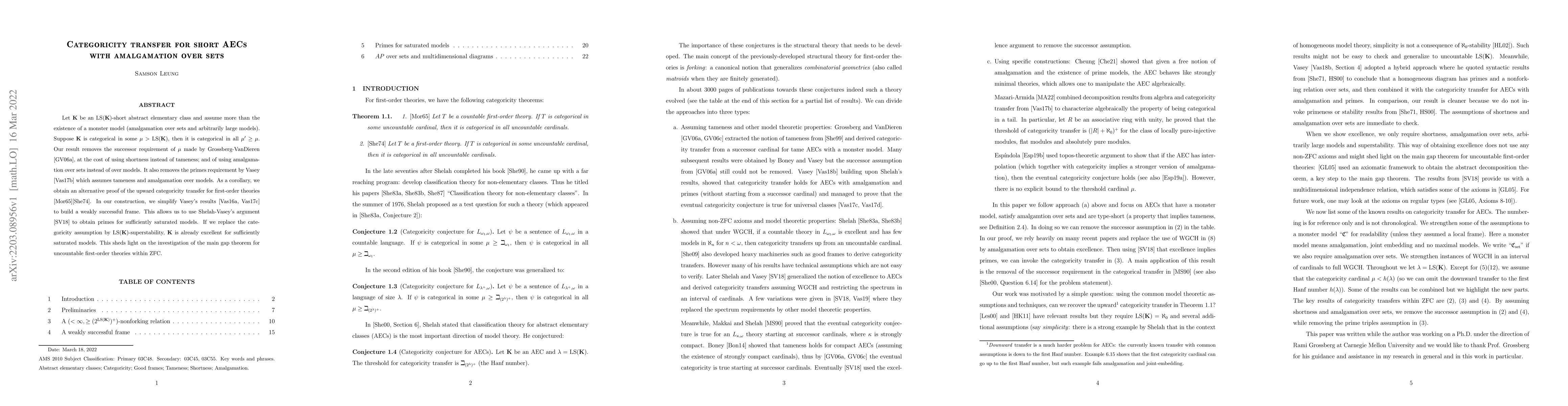 Let ${\bf K}$ be an $\mathrm{LS}({\bf K})$-short abstract elementary class and assume more than the existence of a monster model (amalgamation over sets and arbitrarily large models). Suppose ${\bf K}$ is categorical in some $\mu>\mathrm{LS}({\bf K})$, then it is categorical in all $\mu'\geq\mu$. Our result removes the successor requirement of $\mu$ made by Grossberg-VanDieren, at the cost of using shortness instead of tameness; and of using amalgamation over sets instead of over models. It also removes the primes requirement by Vasey which assumes tameness and amalgamation over models. As a corollary, we obtain an alternative proof of the upward categoricity transfer for first-order theories by Morley and Shelah. In our construction, we simplify Vasey's results to build a weakly successful frame. This allows us to use Shelah-Vasey's argument to obtain primes for sufficiently saturated models. If we replace the categoricity assumption by $\mathrm{LS}({\bf K})$-superstability, ${\bf K}$ is already excellent for sufficiently saturated models. This sheds light on the investigation of the main gap theorem for uncountable first-order theories within ZFC.