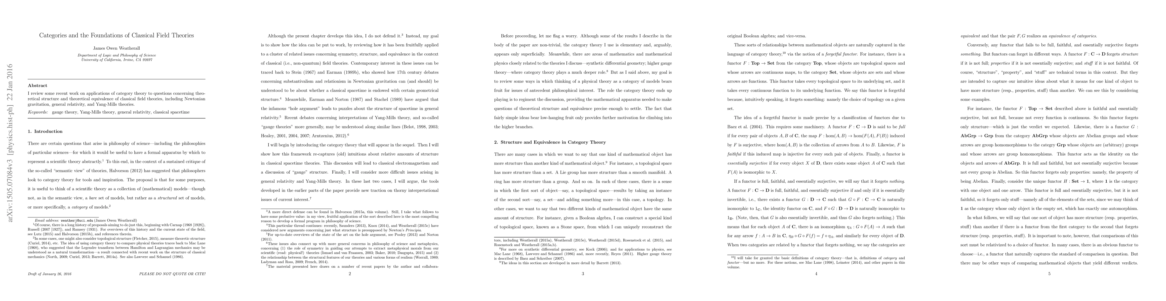 This paper explores how category theory is applied to classical field theories like Newtonian gravitation and general relativity, revealing connections between theoretical structure and equivalence.