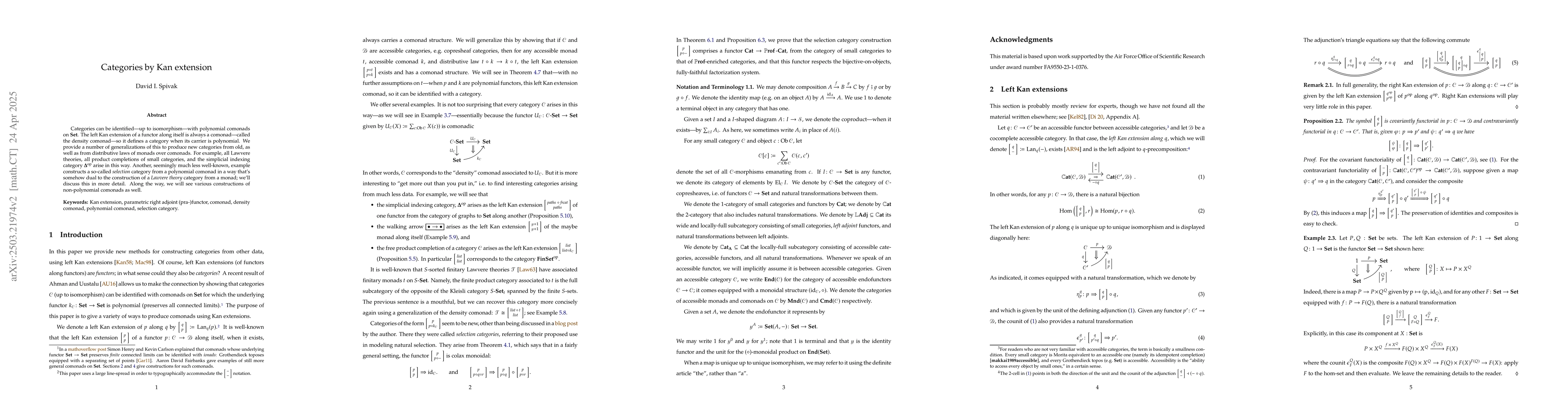 The paper introduces a systematic method for constructing categories via Kan extensions and polynomial functors, generalizing density comonads and providing a dual construction for selection categories.