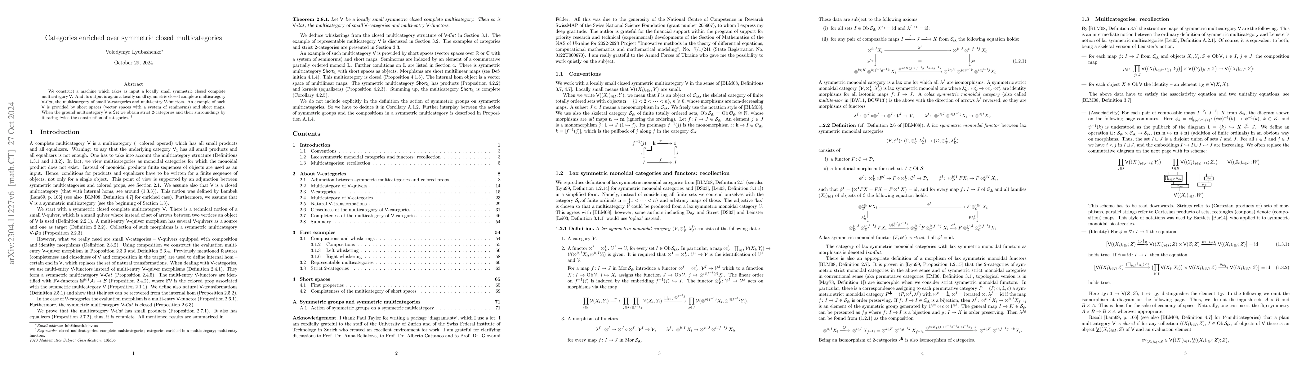 We construct a machine which takes as input a locally small symmetric closed complete multicategory $\mathsf V$. And its output is again a locally small symmetric closed complete multicategory $\mathsf V\text-\mathcal{C}at$, the multicategory of small $\mathsf V$-categories and multi-entry $\mathsf V$-functors. An example of such $\mathsf V$ is provided by short spaces (vector spaces with a system of seminorms) and short maps. When the ground multicategory $\mathsf V$ is $\mathsf{Set}$ we obtain strict 2-categories and their surroundings by iterating twice the construction of categories.
