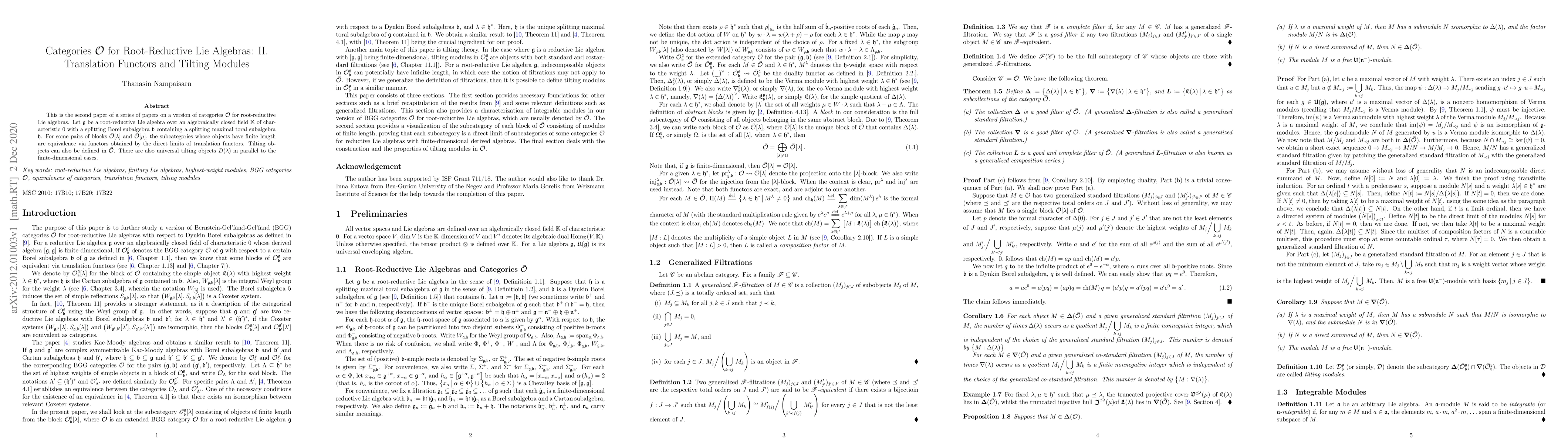 This paper explores categories $\mathcal{O}$ for root-reductive Lie algebras, demonstrating equivalence between subcategories via translation functors, and introduces tilting modules and universal tilting objects $D(\lambda)$.