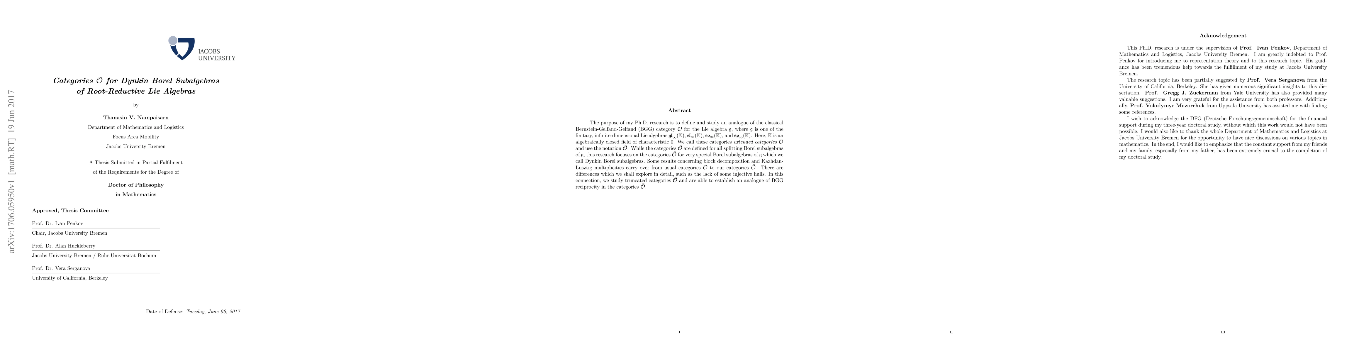 The purpose of my Ph.D. research is to define and study an analogue of the classical Bernstein-Gelfand-Gelfand (BGG) category $\mathcal{O}$ for the Lie algebra $\mathfrak{g}$, where $\mathfrak{g}$ is one of the finitary, infinite-dimensional Lie algebras $\mathfrak{gl}_\infty(\mathbb{K})$, $\mathfrak{sl}_\infty(\mathbb{K})$, $\mathfrak{so}_\infty(\mathbb{K})$, and $\mathfrak{sp}_\infty(\mathbb{K})$. Here, $\mathbb{K}$ is an algebraically closed field of characteristic $0$. We call these categories "extended categories $\mathcal{O}$" and use the notation $\bar{\mathcal{O}}$. While the categories $\bar{\mathcal{O}}$ are defined for all splitting Borel subalgebras of $\mathfrak{g}$, this research focuses on the categories $\bar{\mathcal{O}}$ for very special Borel subalgebras of $\mathfrak{g}$ which we call Dynkin Borel subalgebras. Some results concerning block decomposition and Kazhdan-Lusztig multiplicities carry over from usual categories $\mathcal{O}$ to our categories $\bar{\mathcal{O}}$. There are differences which we shall explore in detail, such as the lack of some injective hulls. In this connection, we study truncated categories $\bar{\mathcal{O}}$ and are able to establish an analogue of BGG reciprocity in the categories $\bar{\mathcal{O}}$.