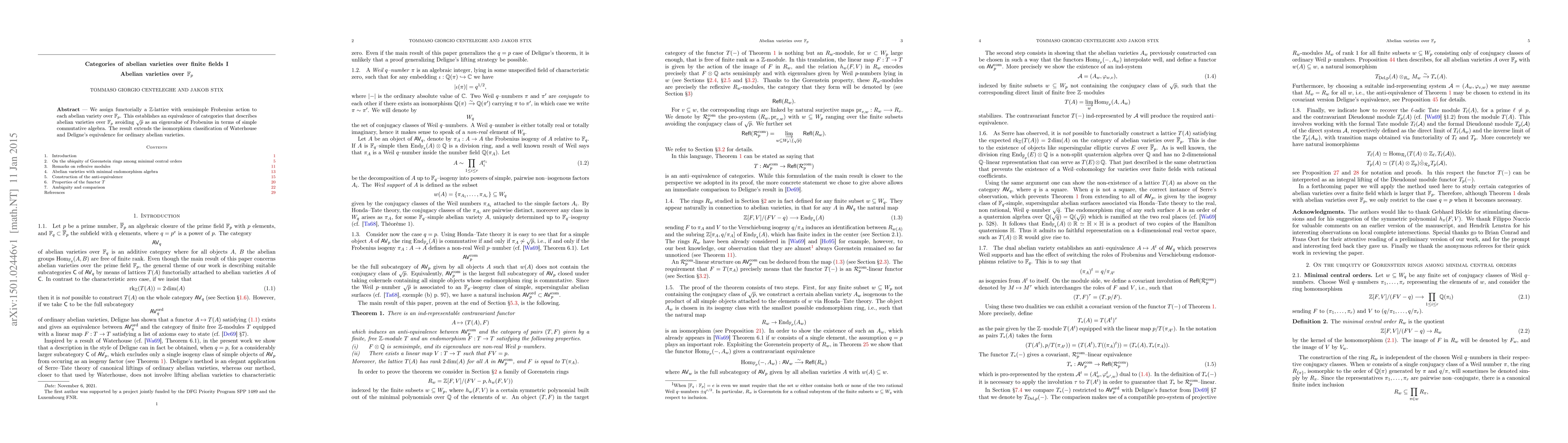 We assign functorially a $\mathbb{Z}$-lattice with semisimple Frobenius action to each abelian variety over $\mathbb{F}_p$. This establishes an equivalence of categories that describes abelian varieties over $\mathbb{F}_p$ avoiding $\sqrt{p}$ as an eigenvalue of Frobenius in terms of simple commutative algebra. The result extends the isomorphism classification of Waterhouse and Deligne's equivalence for ordinary abelian varieties.