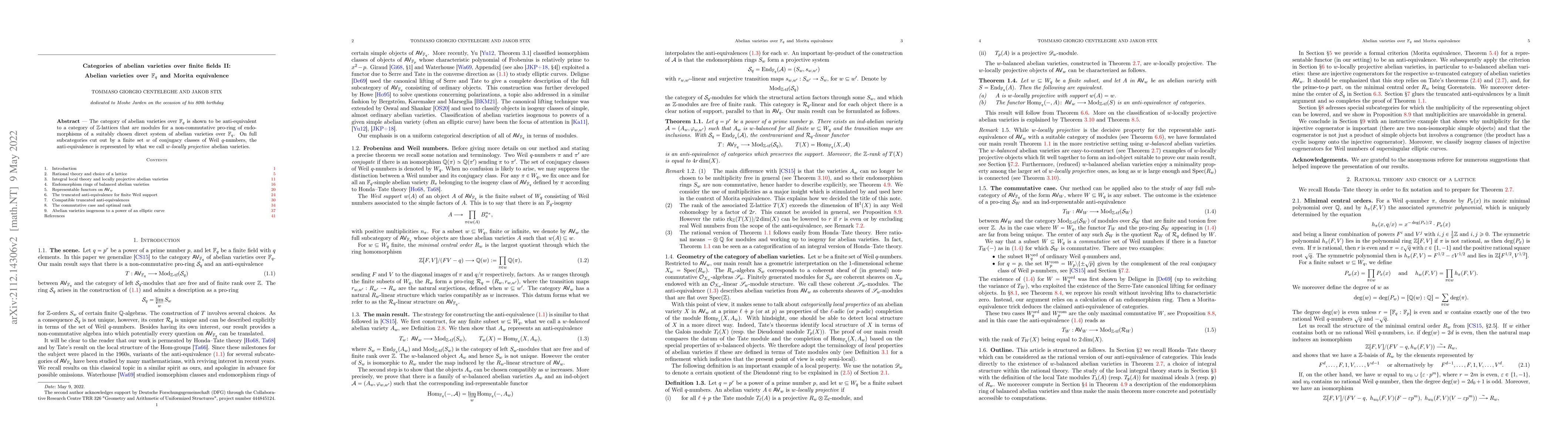 The paper establishes an anti-equivalence between the category of abelian varieties over finite fields and a category of $\mathbb{Z}$-lattices, utilizing Morita equivalence within a specified framework. It introduces the concept of $w$-locally projective abelian varieties for specific subcategories defined by conjugacy classes of Weil $q$-numbers.
