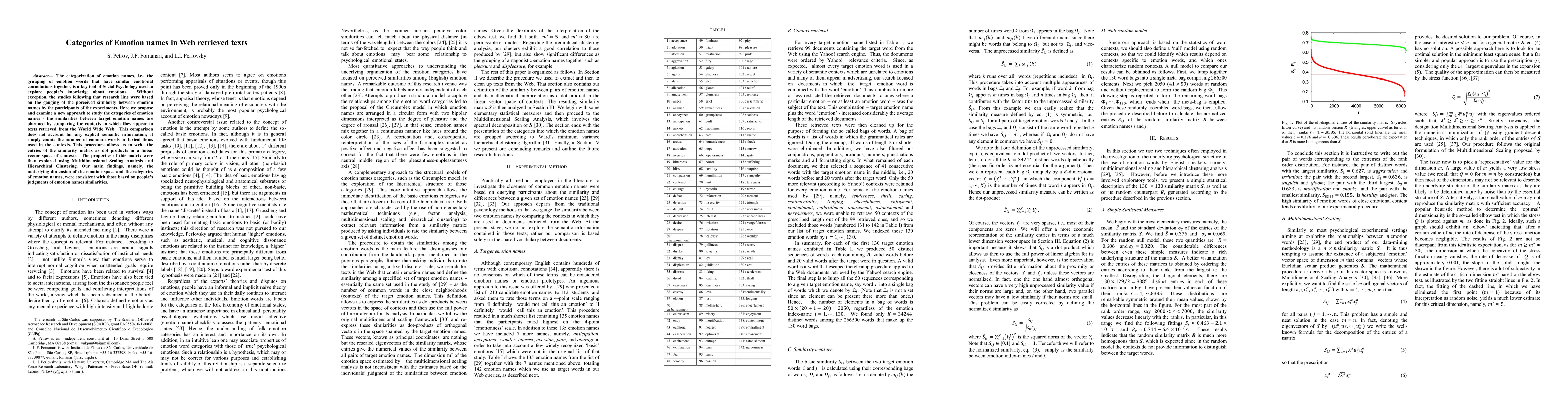 The categorization of emotion names, i.e., the grouping of emotion words that have similar emotional connotations together, is a key tool of Social Psychology used to explore people's knowledge about emotions. Without exception, the studies following that research line were based on the gauging of the perceived similarity between emotion names by the participants of the experiments. Here we propose and examine a new approach to study the categories of emotion names - the similarities between target emotion names are obtained by comparing the contexts in which they appear in texts retrieved from the World Wide Web. This comparison does not account for any explicit semantic information; it simply counts the number of common words or lexical items used in the contexts. This procedure allows us to write the entries of the similarity matrix as dot products in a linear vector space of contexts. The properties of this matrix were then explored using Multidimensional Scaling Analysis and Hierarchical Clustering. Our main findings, namely, the underlying dimension of the emotion space and the categories of emotion names, were consistent with those based on people's judgments of emotion names similarities.