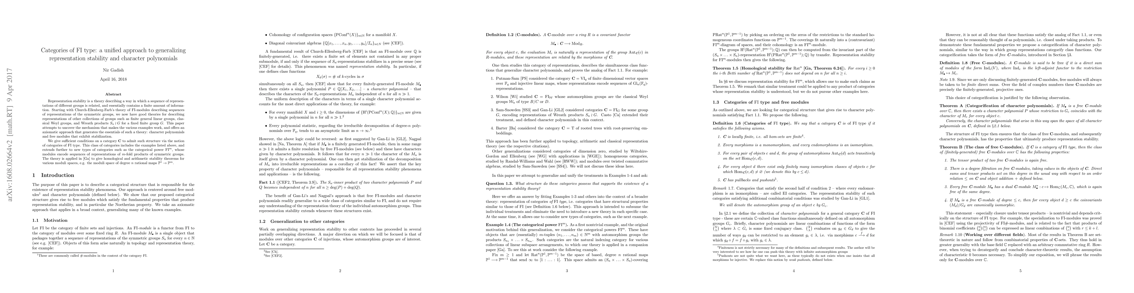 This paper develops a unified approach to representation stability by introducing categories of FI type, which generalize the theory of FI-modules. It provides an axiomatic framework for generating character polynomials and free modules that exhibit stabilization, applicable to various group sequences like symmetric, general linear, and Weyl groups.