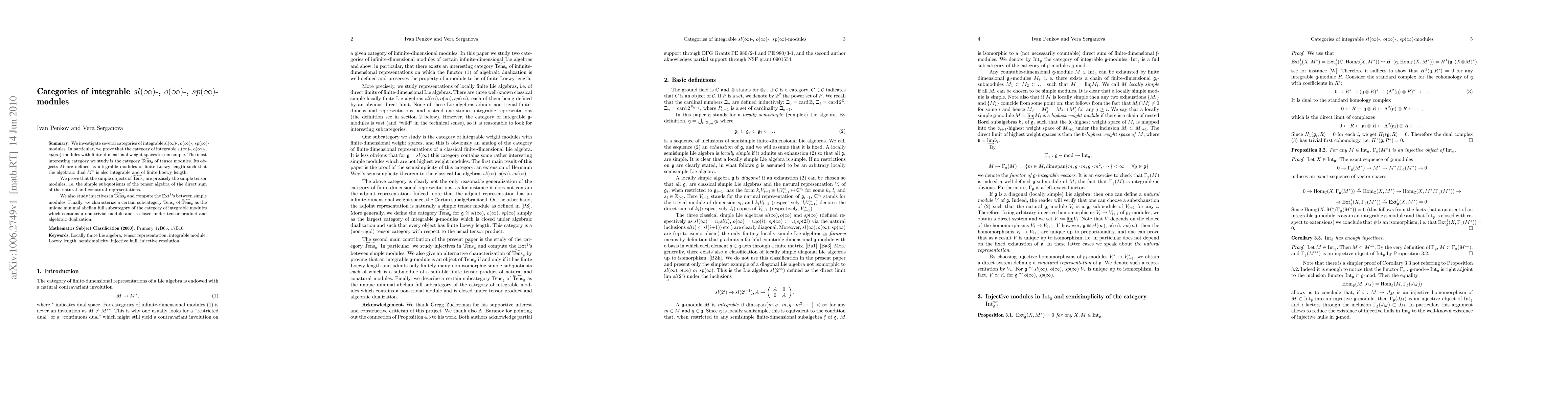 This paper investigates integrable modules of $sl(\infty)$-, $o(\infty)$-, and $sp(\infty)$-algebras, proving that categories with finite-dimensional weight spaces are semisimple. It focuses on tensor modules, proving they have simple subquotients corresponding to tensor algebras and characterizing injectives and Ext$^1$ relations. A specific subcategory of tensor modules is identified as the minimal abelian full subcategory closed under tensor product and dualization.