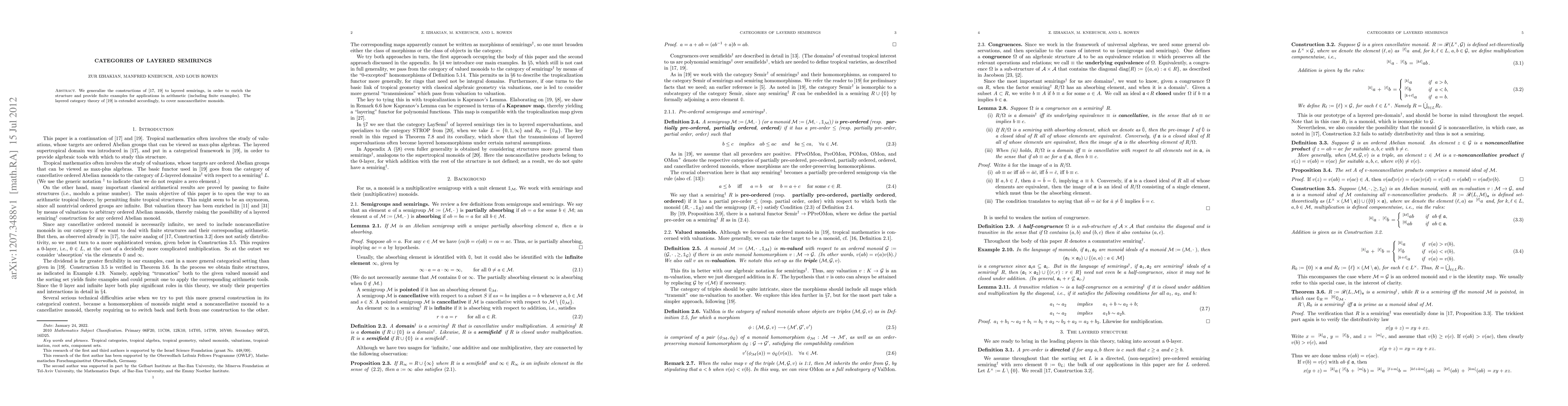We generalize the constructions of [17,19] to layered semirings, in order to enrich the structure and provide finite examples for applications in arithmetic (including finite examples). The layered category theory of [19] is extended accordingly, to cover noncancellative monoids.
