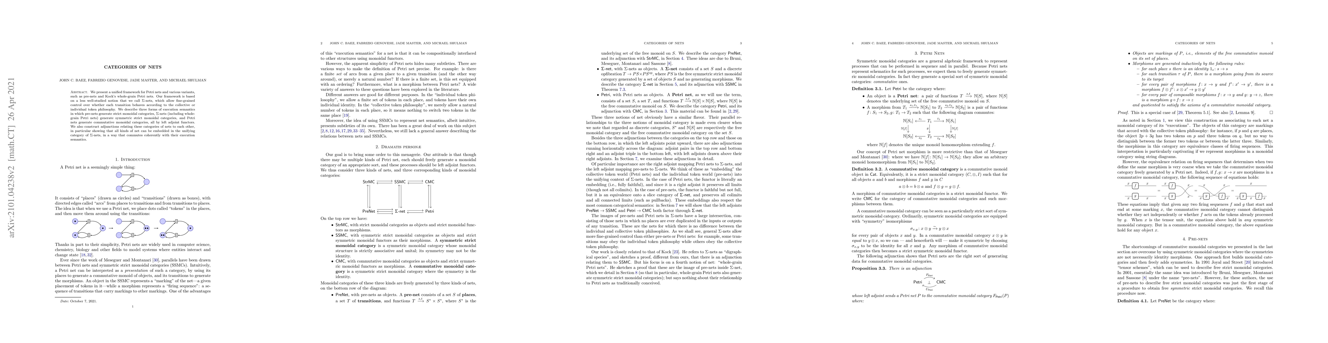 We present a unified framework for Petri nets and various variants, such as pre-nets and Kock's whole-grain Petri nets. Our framework is based on a less well-studied notion that we call $\Sigma$-nets, which allow finer control over whether tokens are treated using the collective or individual token philosophy. We describe three forms of execution semantics in which pre-nets generate strict monoidal categories, $\Sigma$-nets (including whole-grain Petri nets) generate symmetric strict monoidal categories, and Petri nets generate commutative monoidal categories, all by left adjoint functors. We also construct adjunctions relating these categories of nets to each other, in particular showing that all kinds of net can be embedded in the unifying category of $\Sigma$-nets, in a way that commutes coherently with their execution semantics.