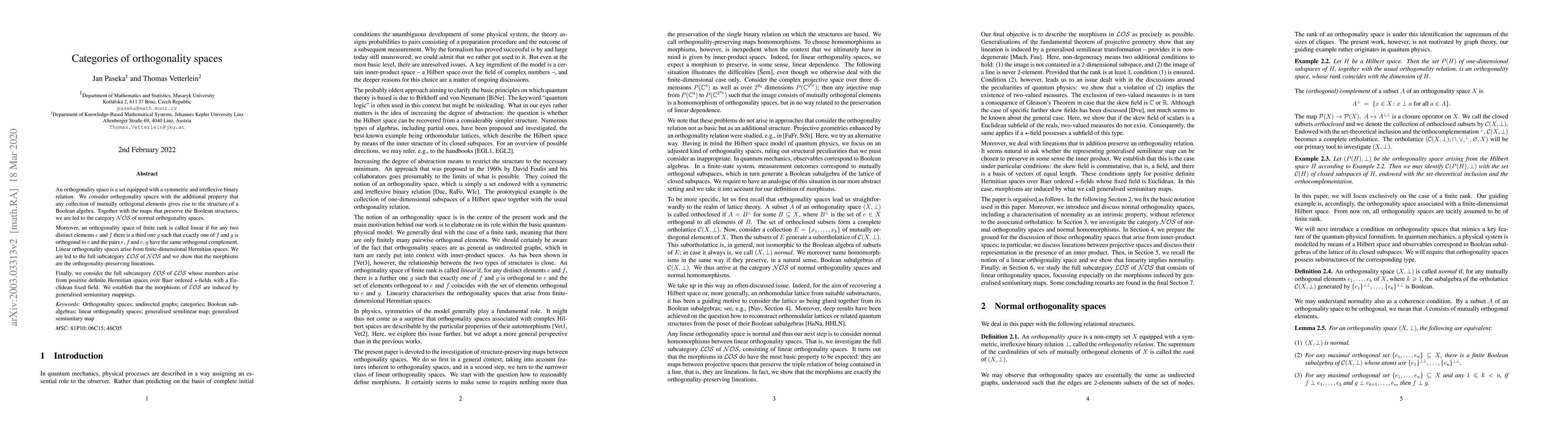 This paper categorizes orthogonality spaces, focusing on those forming Boolean algebras from mutually orthogonal elements, leading to the category ${\mathcal N}{\mathcal O}{\mathcal S}$. It introduces linear orthogonality spaces, arising from finite-dimensional Hermitian spaces, and defines the subcategory ${\mathcal L}{\mathcal O}{\mathcal S}$ with morphisms as orthogonality-preserving lineations. Finally, it identifies ${\mathcal E}{\mathcal O}{\mathcal S}$ as a subcategory of ${\mathcal L}{\mathcal O}{\mathcal S}$ with morphisms induced by generalised semiunitary mappings.