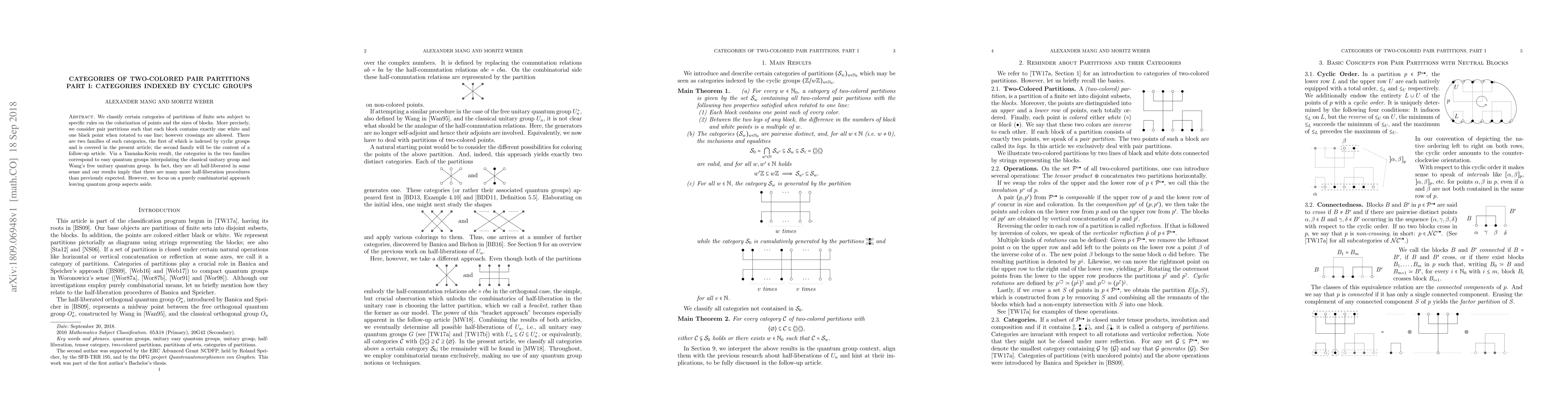 This paper classifies pair partitions of finite sets where each block contains exactly one white and one black point, with crossings allowed, and categorizes them by cyclic groups. The combinatorial approach reveals connections to quantum groups, suggesting more half-liberation procedures than previously anticipated.