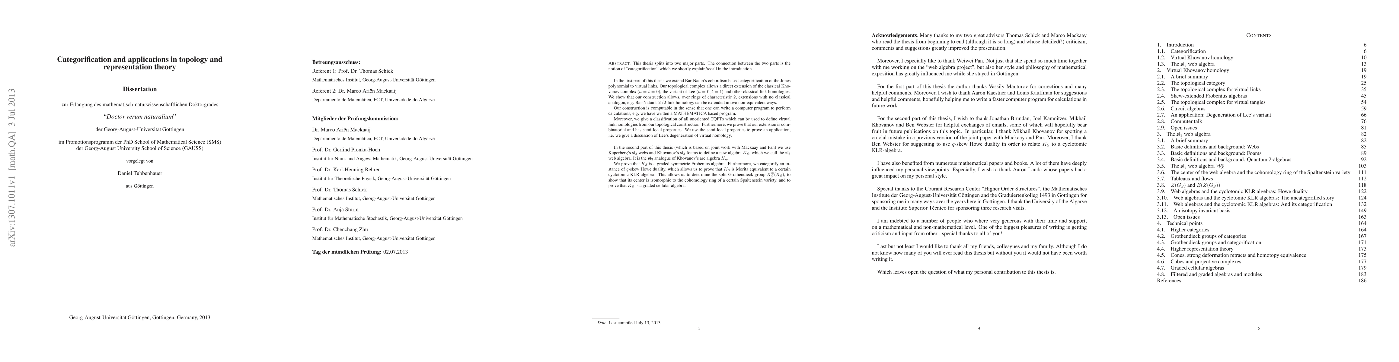 This thesis splits into two major parts. The connection between the two parts is the notion of "categorification" which we shortly explain/recall in the introduction. In the first part of this thesis we extend Bar-Natan's cobordism based categorification of the Jones polynomial to virtual links. Our topological complex allows a direct extension of the classical Khovanov complex (h=t=0), the variant of Lee (h=0,t=1) and other classical link homologies. We show that our construction allows, over rings of characteristic 2, extensions with no classical analogon, e.g. Bar-Natan's Z/2Z-link homology can be extended in two non-equivalent ways. Our construction is computable in the sense that one can write a computer program to perform calculations, e.g. we have written a MATHEMATICA based program. Moreover, we give a classification of all unoriented TQFTs which can be used to define virtual link homologies from our topological construction. Furthermore, we prove that our extension is combinatorial and has semi-local properties. We use the semi-local properties to prove an application, i.e. we give a discussion of Lee's degeneration of virtual homology. In the second part of this thesis (which is based on joint work with Mackaay and Pan) we use Kuperberg's sl3 webs and Khovanov's sl3 foams to define a new algebra K_S, which we call the sl3 web algebra. It is the sl3 analogue of Khovanov's arc algebra H_n. We prove that K_S is a graded symmetric Frobenius algebra. Furthermore, we categorify an instance of q-skew Howe duality, which allows us to prove that K_S is Morita equivalent to a certain cyclotomic KLR-algebra. This allows us to determine the split Grothendieck group K_0(K_S), to show that its center is isomorphic to the cohomology ring of a certain Spaltenstein variety, and to prove that K_S is a graded cellular algebra.