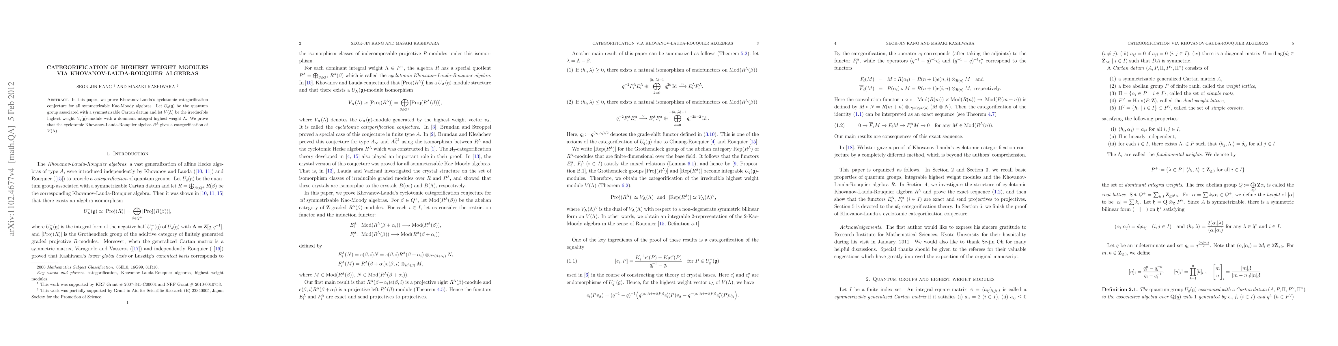 This paper proves Khovanov-Lauda's conjecture that the cyclotomic Khovanov-Lauda-Rouquier algebra categorifies irreducible highest weight modules for all symmetrizable Kac-Moody algebras, thus establishing a deep connection between algebraic structures.