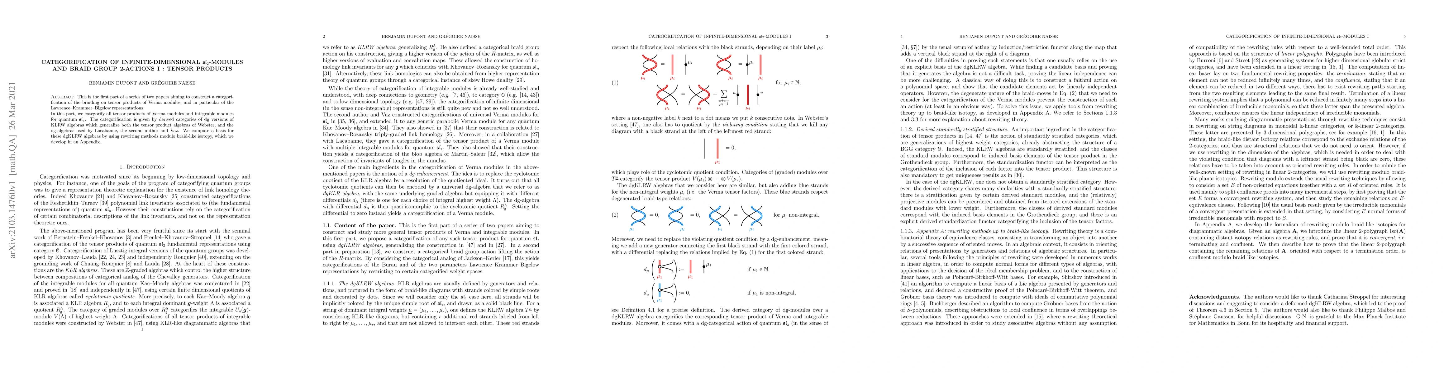This paper constructs a categorification of tensor products of Verma modules using derived categories of dgKLRW algebras, generalizing previous approaches. It develops a basis for these algebras using rewriting methods modulo braid-like isotopy.