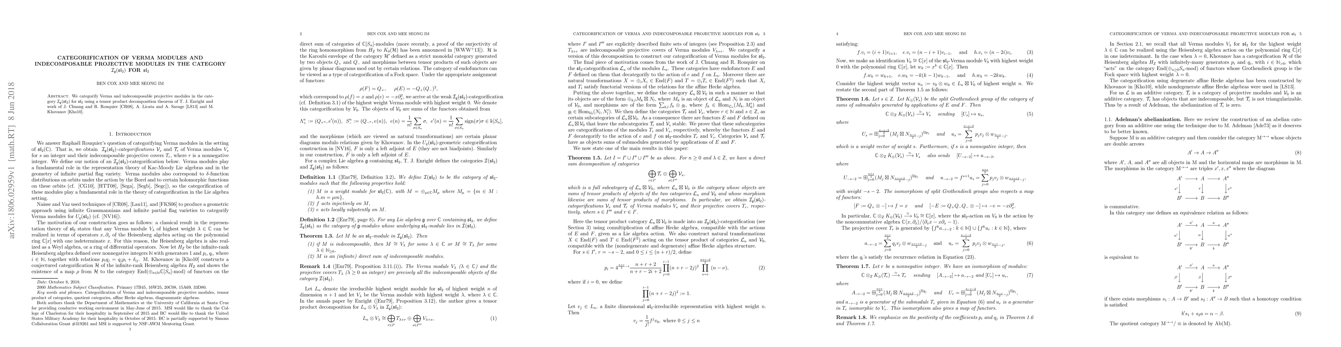 Summary: This paper explores the categorification of Verma and indecomposable projective modules within the category $\mathcal I_{\mathfrak{g}}(\mathfrak{sl}_2)$ for $\mathfrak{sl}_2$, leveraging decomposition theorems and graphical calculus from the works of Enright, Chuang-Rouquier-Licata-Savage, and Khovanov. The focus is on constructing categorical analogs for these modules using advanced algebraic techniques.
