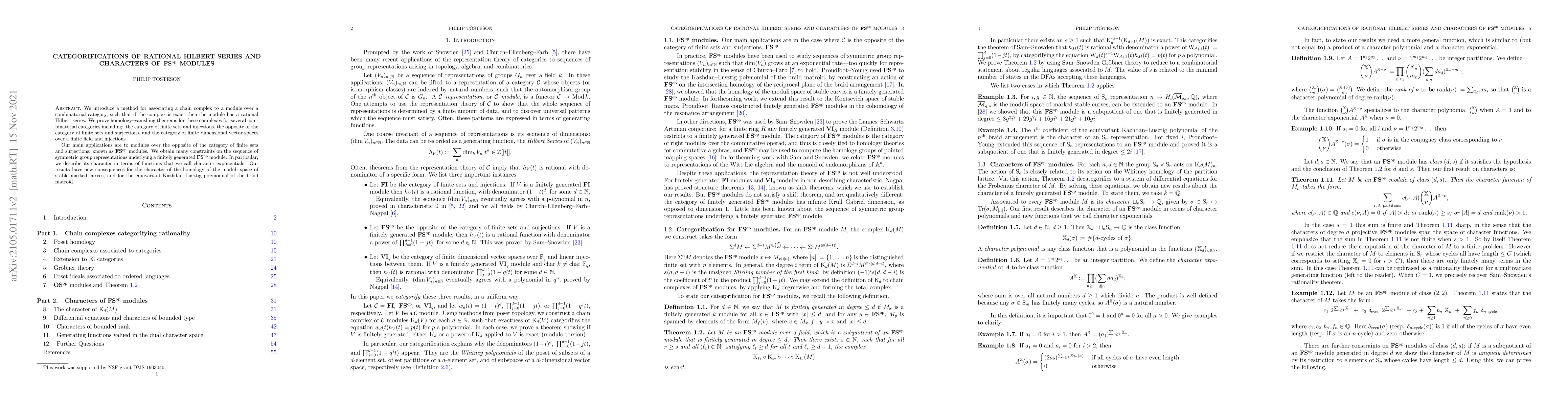 We introduce a method for associating a chain complex to a module over a combinatorial category, such that if the complex is exact then the module has a rational Hilbert series. We prove homology--vanishing theorems for these complexes for several combinatorial categories including: the category of finite sets and injections, the opposite of the category of finite sets and surjections, and the category of finite dimensional vector spaces over a finite field and injections. Our main applications are to modules over the opposite of the category of finite sets and surjections, known as $FS^{op}$ modules. We obtain many constraints on the sequence of symmetric group representations underlying a finitely generated $FS^{op}$ module. In particular, we describe its character in terms of functions that we call character exponentials. Our results have new consequences for the character of the homology of the moduli space of stable marked curves, and for the equivariant Kazhdan-Luzstig polynomial of the braid matroid.