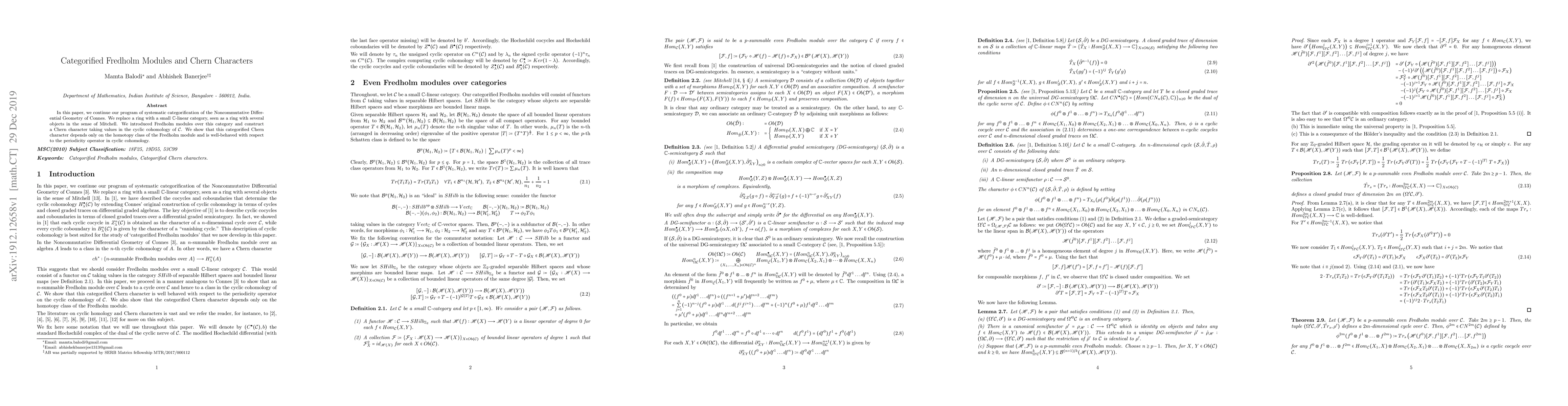 This paper systematically categorifies Connes' Noncommutative Differential Geometry by replacing rings with $\mathbb C$-linear categories, introducing Fredholm modules over these categories, and constructing a Chern character in cyclic cohomology. The categorified Chern character is shown to depend solely on the Fredholm module's homotopy class and behaves well under the periodicity operator.