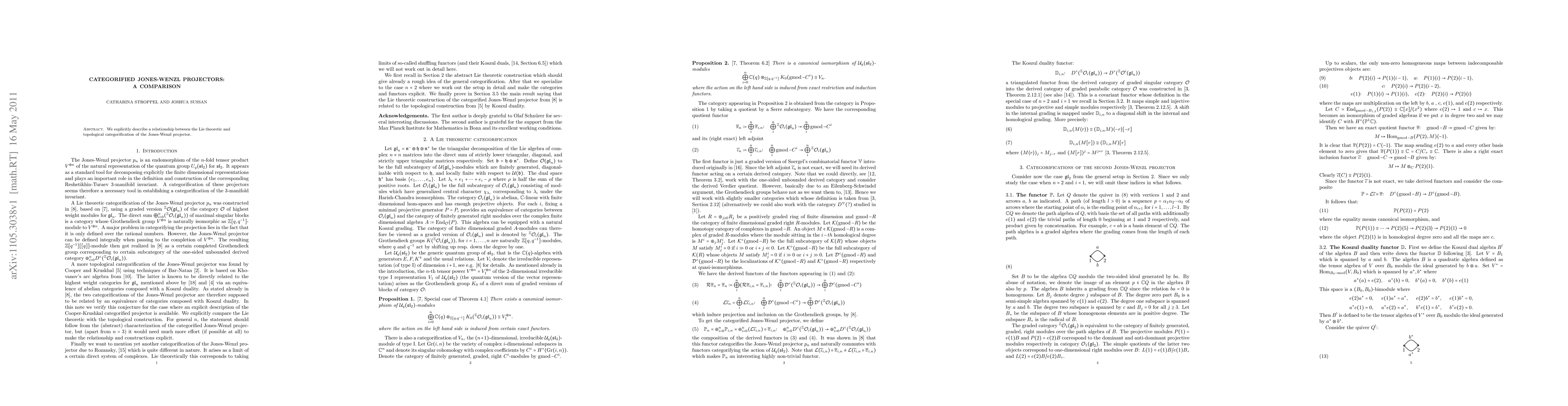 This paper establishes a connection between two distinct categorifications of the Jones-Wenzl projector: one based on Lie theory and the other on topological methods, comparing their structures and implications. The study references prior work found in arXiv:1007.4680 and arXiv:1005.5117.