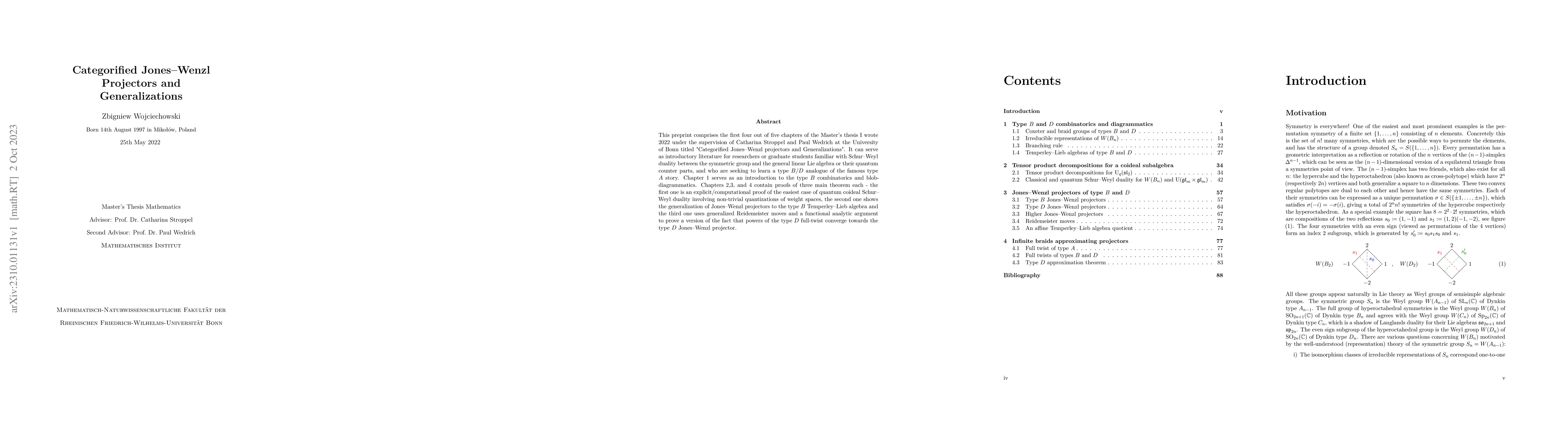 This preprint comprises the first four out of five chapters of the Master's thesis I wrote 2022 under the supervision of Catharina Stroppel and Paul Wedrich at the University of Bonn titled "Categorified Jones-Wenzl projectors and Generalizations". Chapter 1 can serve as introductory literature for researchers or graduate students familiar with Schur-Weyl duality between the symmetric group and the general linear Lie algebra or their quantum counter parts, and who are seeking to learn a type B/D analogue of the famous type A story. Chapter 1 serves as an introduction to the type B combinatorics and blob-diagrammatics. Chapters 2,3, and 4 contain proofs of three main theorem each - the first one is an explicit/computational proof of the easiest case of quantum coideal Schur-Weyl duality involving non-trivial quantizations of weight spaces, the second one shows the generalization of Jones-Wenzl projectors to the type B Temperley-Lieb algebra and the third one uses generalized Reidemeister moves and a functional analytic argument to prove a version of the fact that powers of the type D full-twist converge towards the type D Jones-Wenzl projector.