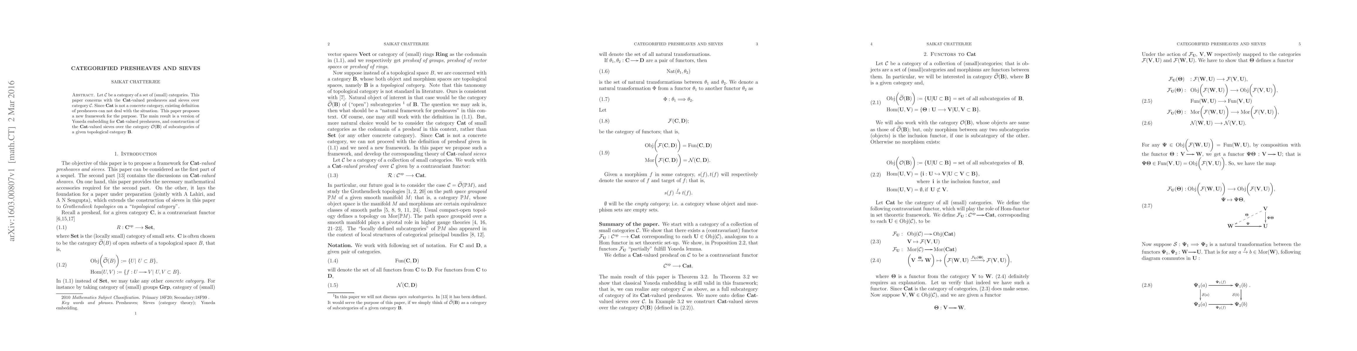 Let $\mathcal C$ be a category of a set of (small) categories. This paper concerns with the ${\mathbf {Cat}}$-valued presheaves and sieves over category $\mathcal C.$ Since ${\mathbf {Cat}}$ is not a concrete category, existing definition of presheaves can not deal with the situation. This paper proposes a new framework for the purpose. The main result is a version of Yoneda embedding for ${\mathbf {Cat}}$-valued presheaves, and construction of the ${\mathbf {Cat}}$-valued sieves over the category ${\mathcal O}(\mathbf B)$ of subcategories of a given topological category $\mathbf B.$