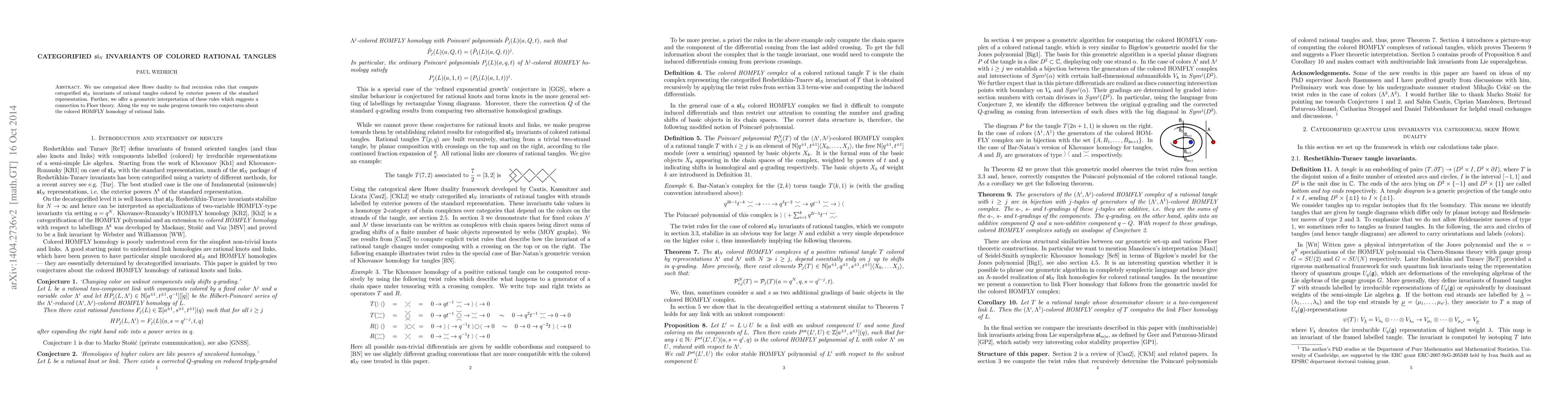 The paper develops recursive rules for categorified sl(N) invariants of colored rational tangles using categorical skew Howe duality and connects these findings to Floer theory, also making progress on conjectures about colored HOMFLY homology. The geometric interpretation of the recursion rules provides a new insight into the relationship between these invariants and knot theory.