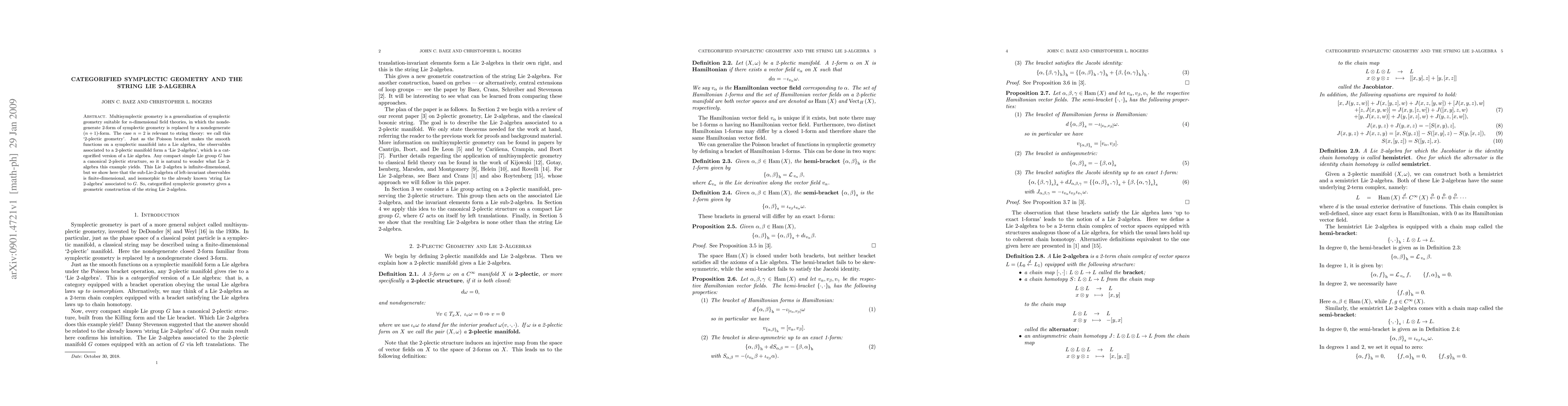 This paper explores the relationship between categorified symplectic geometry and string theory, demonstrating that the 2-plectic geometry associated with a compact simple Lie group G leads to a finite-dimensional sub-Lie 2-algebra isomorphic to the string Lie 2-algebra, thereby providing a geometric construction of the latter.