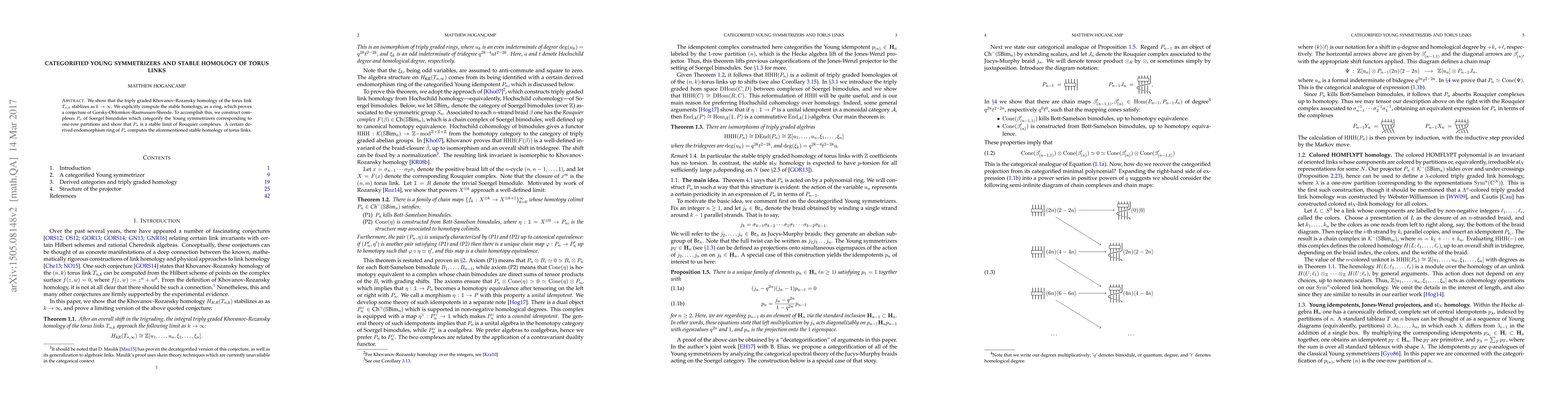 We show that the triply graded Khovanov-Rozansky homology of the torus link $T_{n,k}$ stablizes as $k\to \infty$. We explicitly compute the stable homology (as a ring), which proves a conjecture of Gorsky-Oblomkov-Rasmussen-Shende. To accomplish this, we construct complexes $P_n$ of Soergel bimodules which categorify the Young symmetrizers corresponding to one-row partitions and show that $P_n$ is a stable limit of Rouquier complexes. A certain derived endomorphism ring of $P_n$ computes the aforementioned stable homology of torus links.