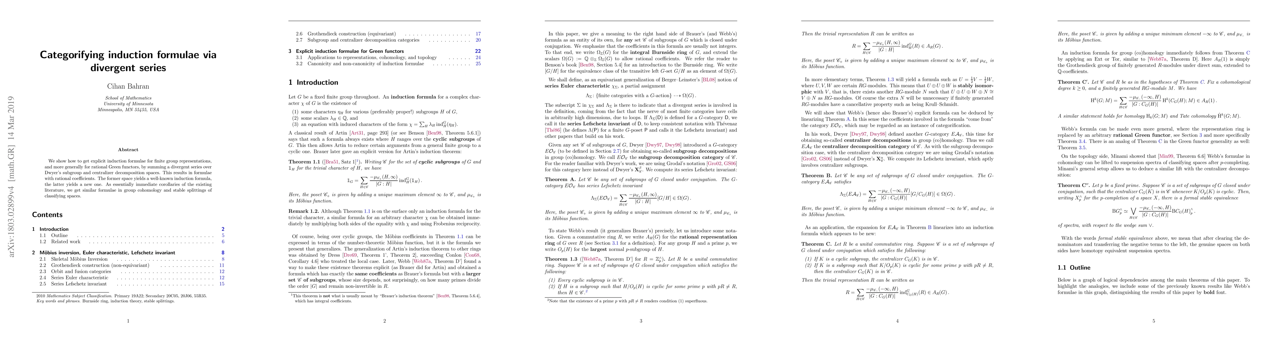 This paper presents a method to derive explicit induction formulae for finite group representations and rational Green functors by summing divergent series over subgroup and centralizer decomposition spaces, yielding rational coefficient results. It also extends these findings to group cohomology and stable splittings of classifying spaces.