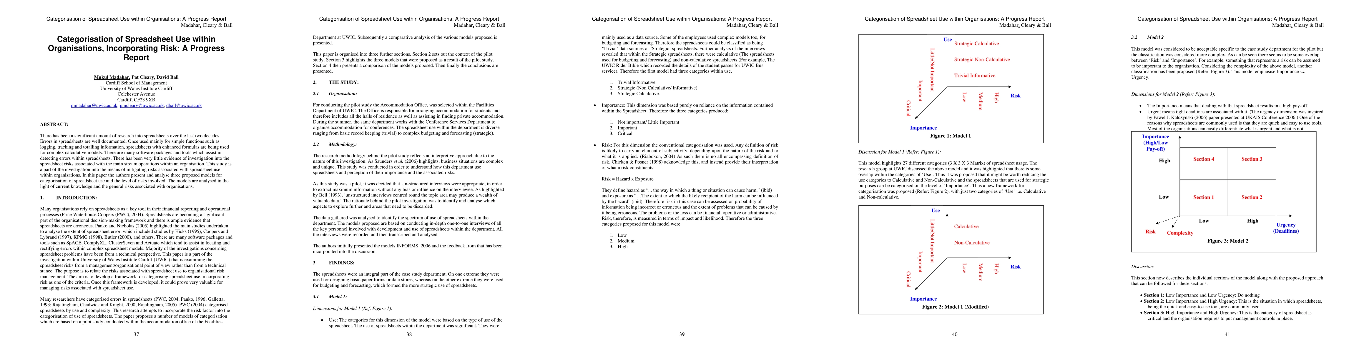 This paper investigates the risks associated with spreadsheet use in organisations, proposing three models for categorising spreadsheet applications and their associated risks. The study aims to mitigate risks and provides an analysis of these models in the context of current organisational knowledge and general risk factors.