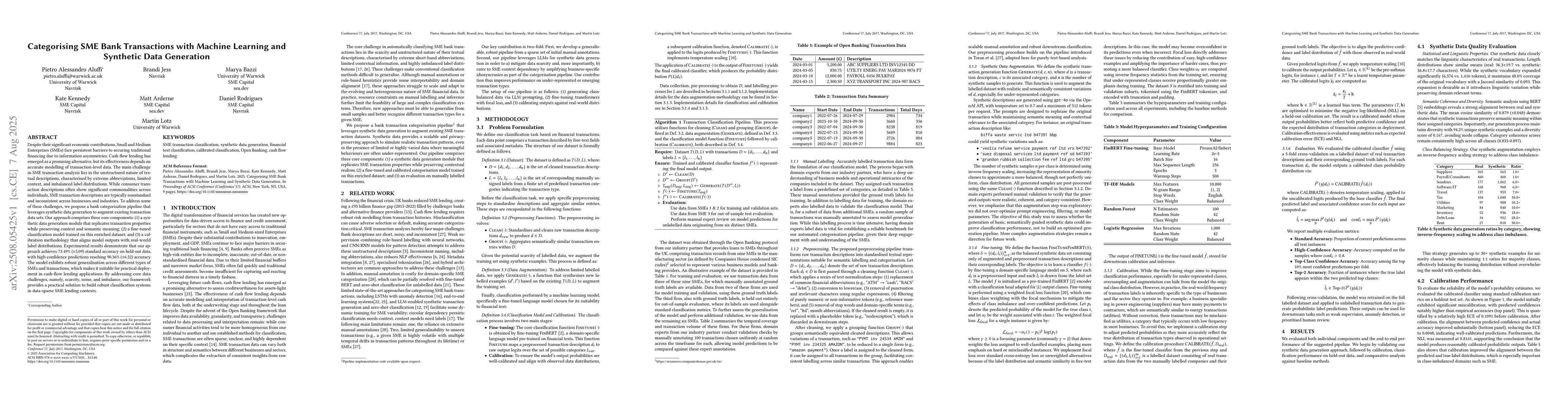 Despite their significant economic contributions, Small and Medium Enterprises (SMEs) face persistent barriers to securing traditional financing due to information asymmetries. Cash flow lending has emerged as a promising alternative, but its effectiveness depends on accurate modelling of transaction-level data. The main challenge in SME transaction analysis lies in the unstructured nature of textual descriptions, characterised by extreme abbreviations, limited context, and imbalanced label distributions. While consumer transaction descriptions often show significant commonalities across individuals, SME transaction descriptions are typically nonstandard and inconsistent across businesses and industries. To address some of these challenges, we propose a bank categorisation pipeline that leverages synthetic data generation to augment existing transaction data sets. Our approach comprises three core components: (1) a synthetic data generation module that replicates transaction properties while preserving context and semantic meaning; (2) a fine-tuned classification model trained on this enriched dataset; and (3) a calibration methodology that aligns model outputs with real-world label distributions. Experimental results demonstrate that our approach achieves 73.49% (+-5.09) standard accuracy on held-out data, with high-confidence predictions reaching 90.36% (+-6.52) accuracy. The model exhibits robust generalisation across different types of SMEs and transactions, which makes it suitable for practical deployment in cash-flow lending applications. By addressing core data challenges, namely, scarcity, noise, and imbalance, our framework provides a practical solution to build robust classification systems in data-sparse SME lending contexts.