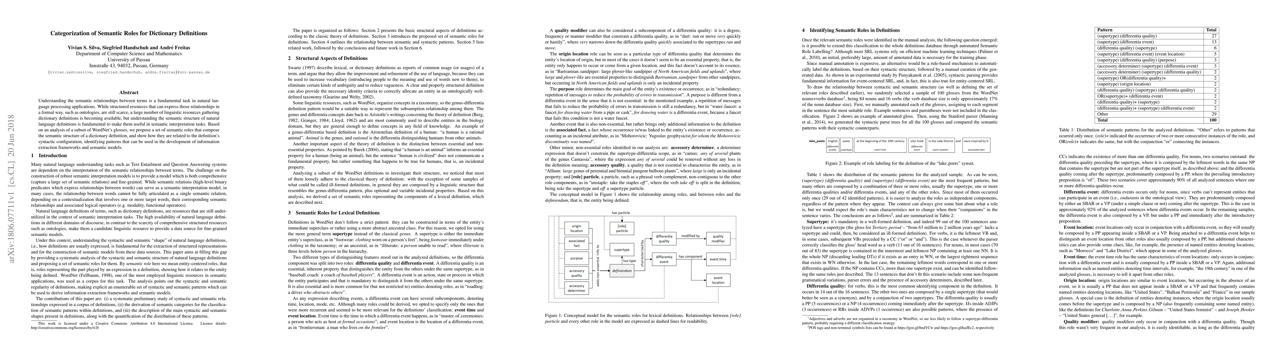 This paper proposes a categorization of semantic roles in dictionary definitions to enhance natural language processing applications. By analyzing WordNet's glosses, it identifies patterns and relationships that can improve information extraction frameworks and semantic models.