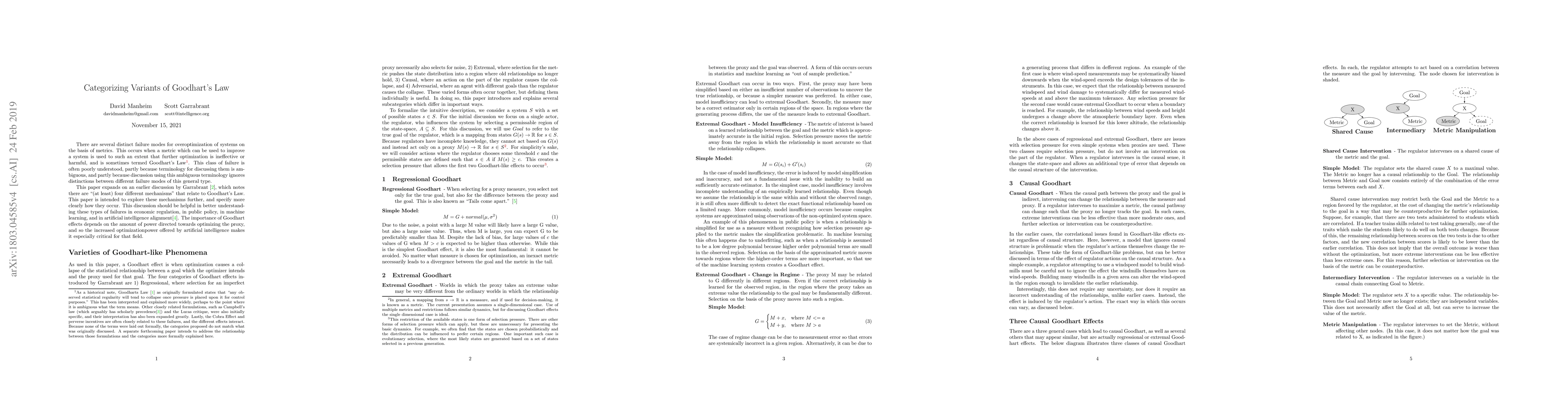 There are several distinct failure modes for overoptimization of systems on the basis of metrics. This occurs when a metric which can be used to improve a system is used to an extent that further optimization is ineffective or harmful, and is sometimes termed Goodhart's Law. This class of failure is often poorly understood, partly because terminology for discussing them is ambiguous, and partly because discussion using this ambiguous terminology ignores distinctions between different failure modes of this general type. This paper expands on an earlier discussion by Garrabrant, which notes there are "(at least) four different mechanisms" that relate to Goodhart's Law. This paper is intended to explore these mechanisms further, and specify more clearly how they occur. This discussion should be helpful in better understanding these types of failures in economic regulation, in public policy, in machine learning, and in Artificial Intelligence alignment. The importance of Goodhart effects depends on the amount of power directed towards optimizing the proxy, and so the increased optimization power offered by artificial intelligence makes it especially critical for that field.