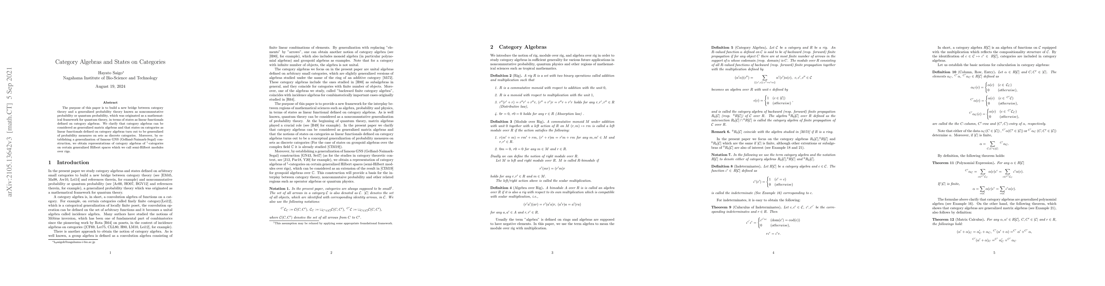 This paper establishes a new connection between category theory and quantum probability by defining states on category algebras as generalized probability measures. It also generalizes the GNS construction to represent category algebras on semi-Hilbert modules over rigs, extending the framework to noncommutative settings.
