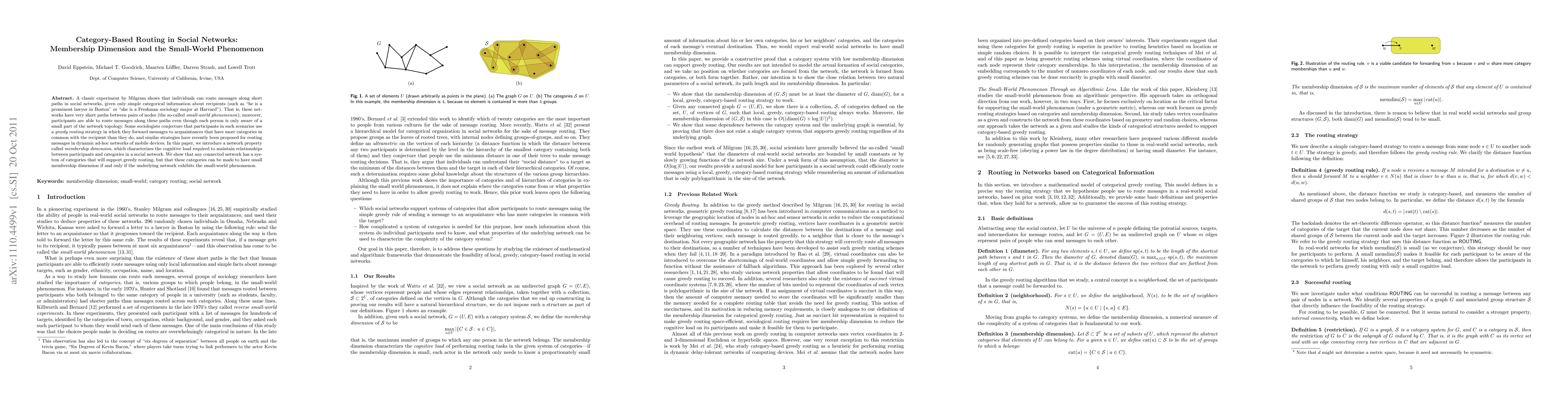 Researchers introduced a network property called membership dimension to study category-based routing in social networks. They found that connected networks with the small-world phenomenon can support greedy routing strategies if their categories have low membership dimension.
