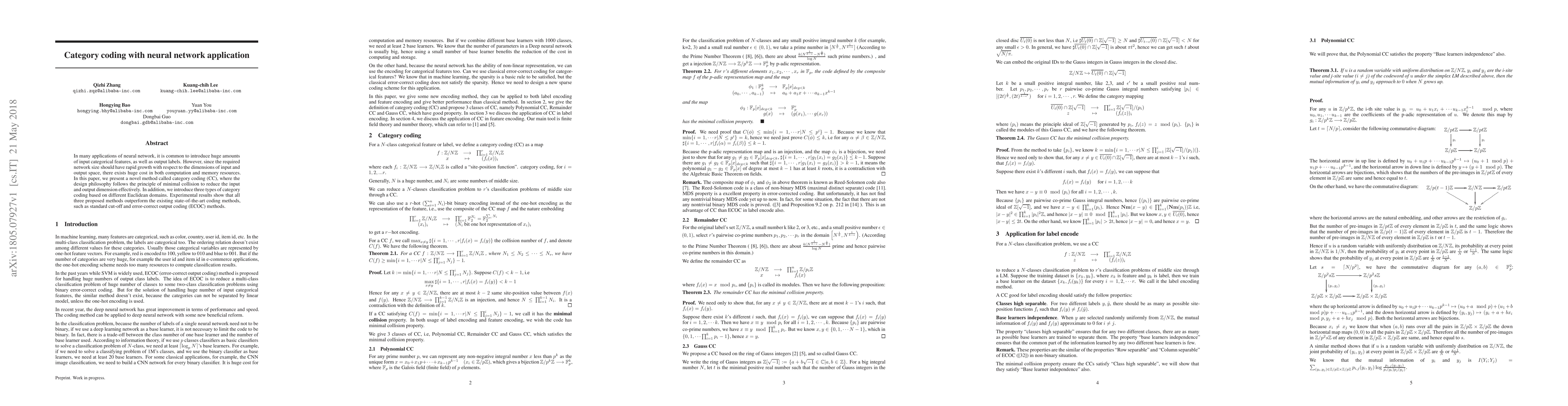 This paper introduces a novel category coding (CC) method to efficiently handle large input categorical features in neural networks, minimizing collision to reduce dimension and cost. Three types of CC based on different Euclidean domains are proposed, with experimental results showing superior performance over existing methods like standard cut-off and ECOC.