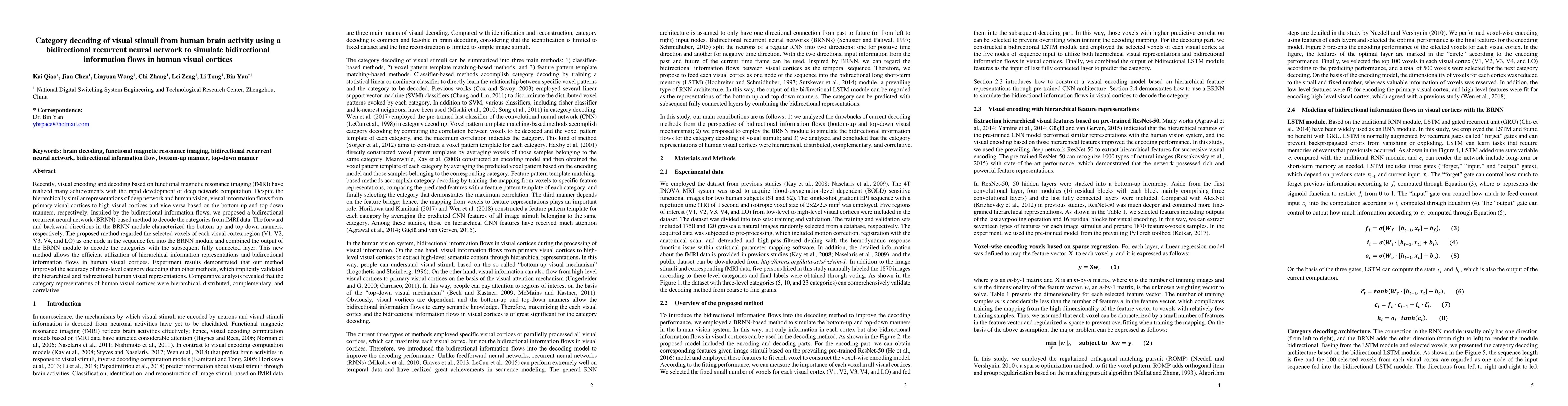 This paper proposes a bidirectional recurrent neural network (BRNN) to decode visual categories from fMRI data, simulating the bidirectional information flows in human visual cortices. The method improves category decoding accuracy by efficiently utilizing hierarchical and bidirectional information representations, demonstrating the hierarchical nature of human visual cortex representations.